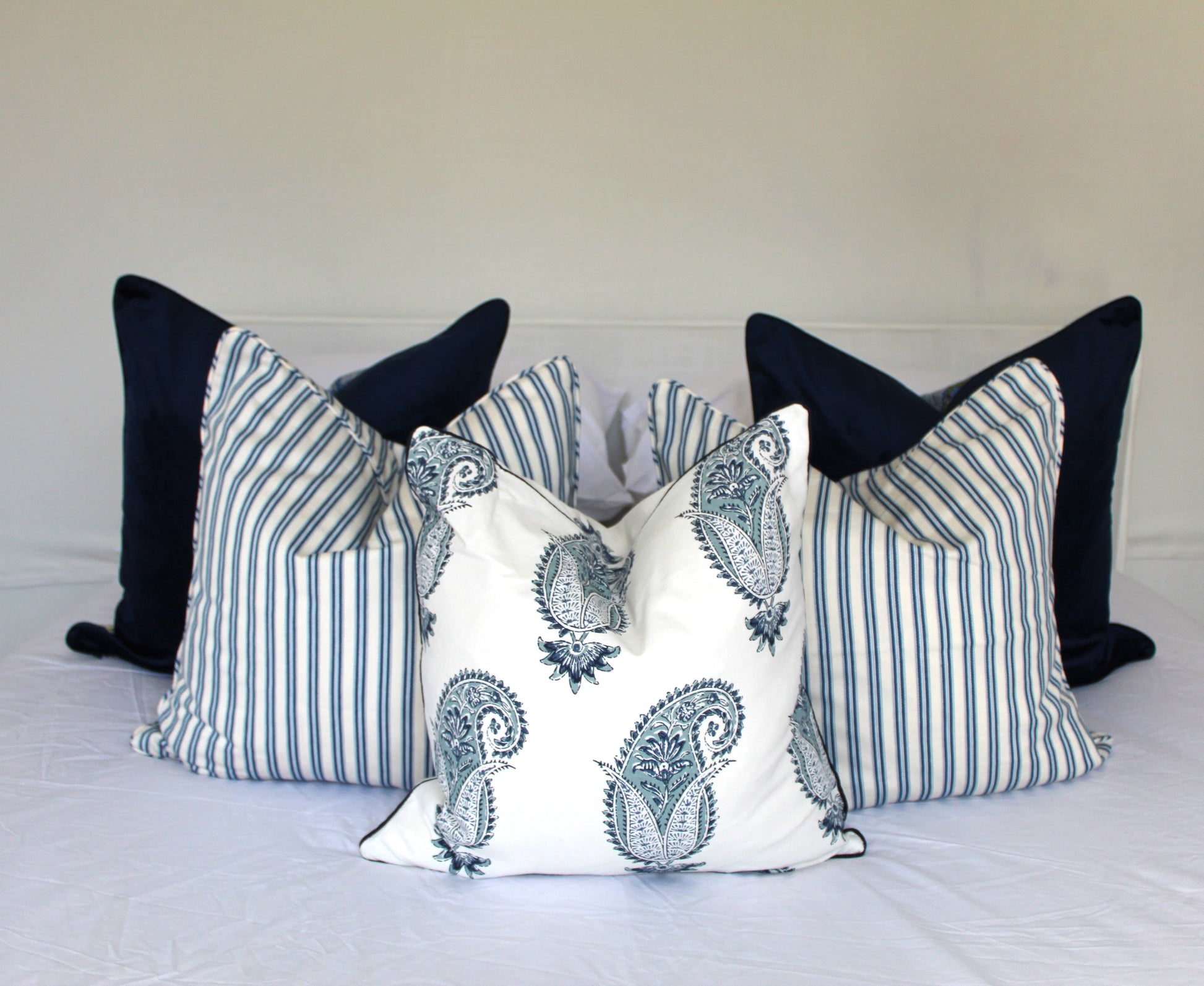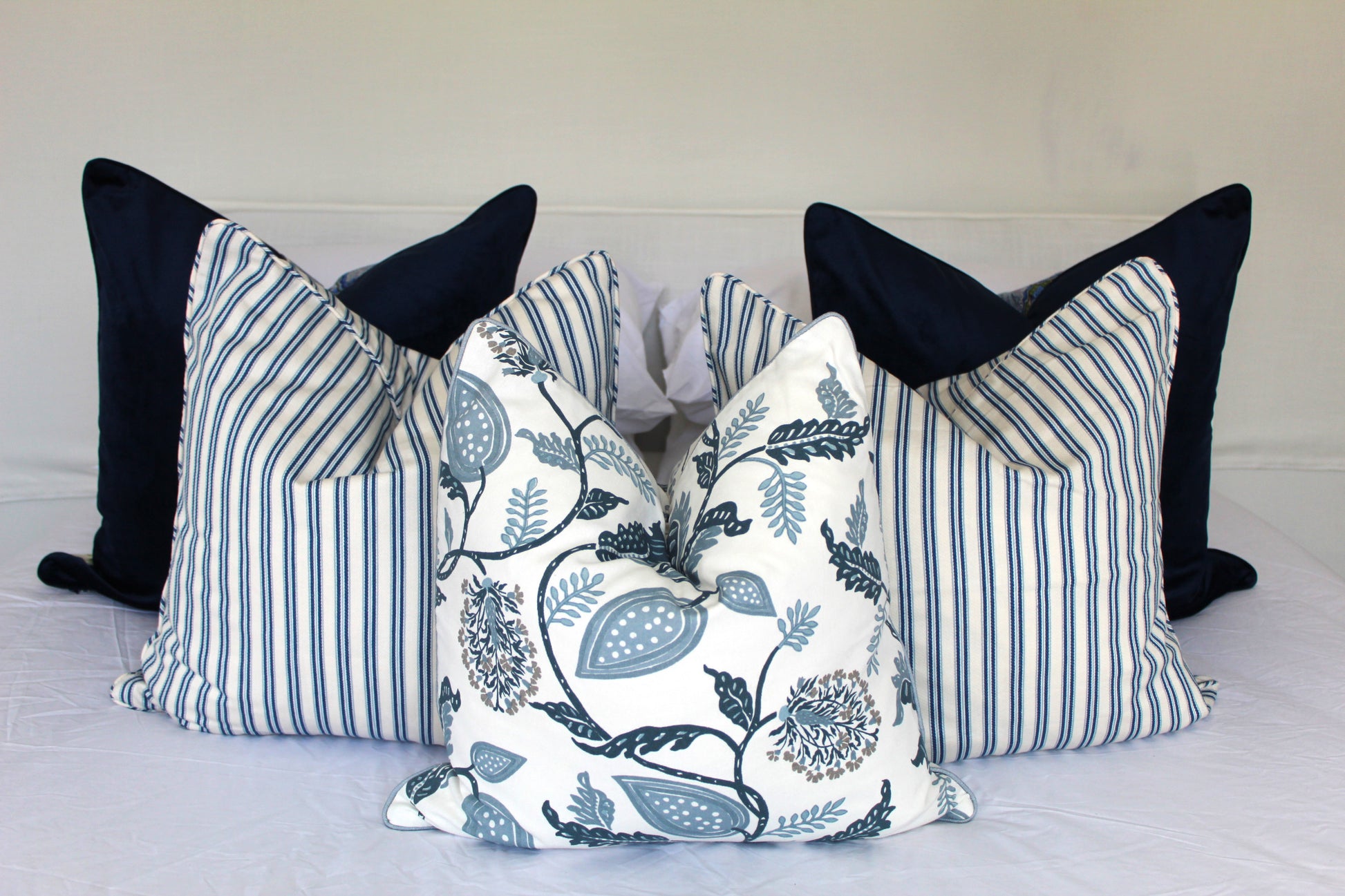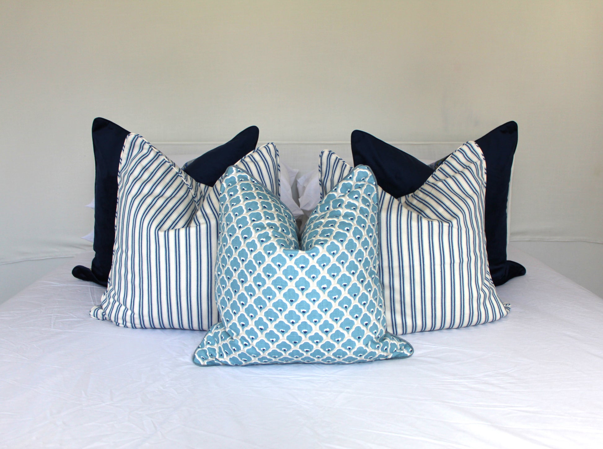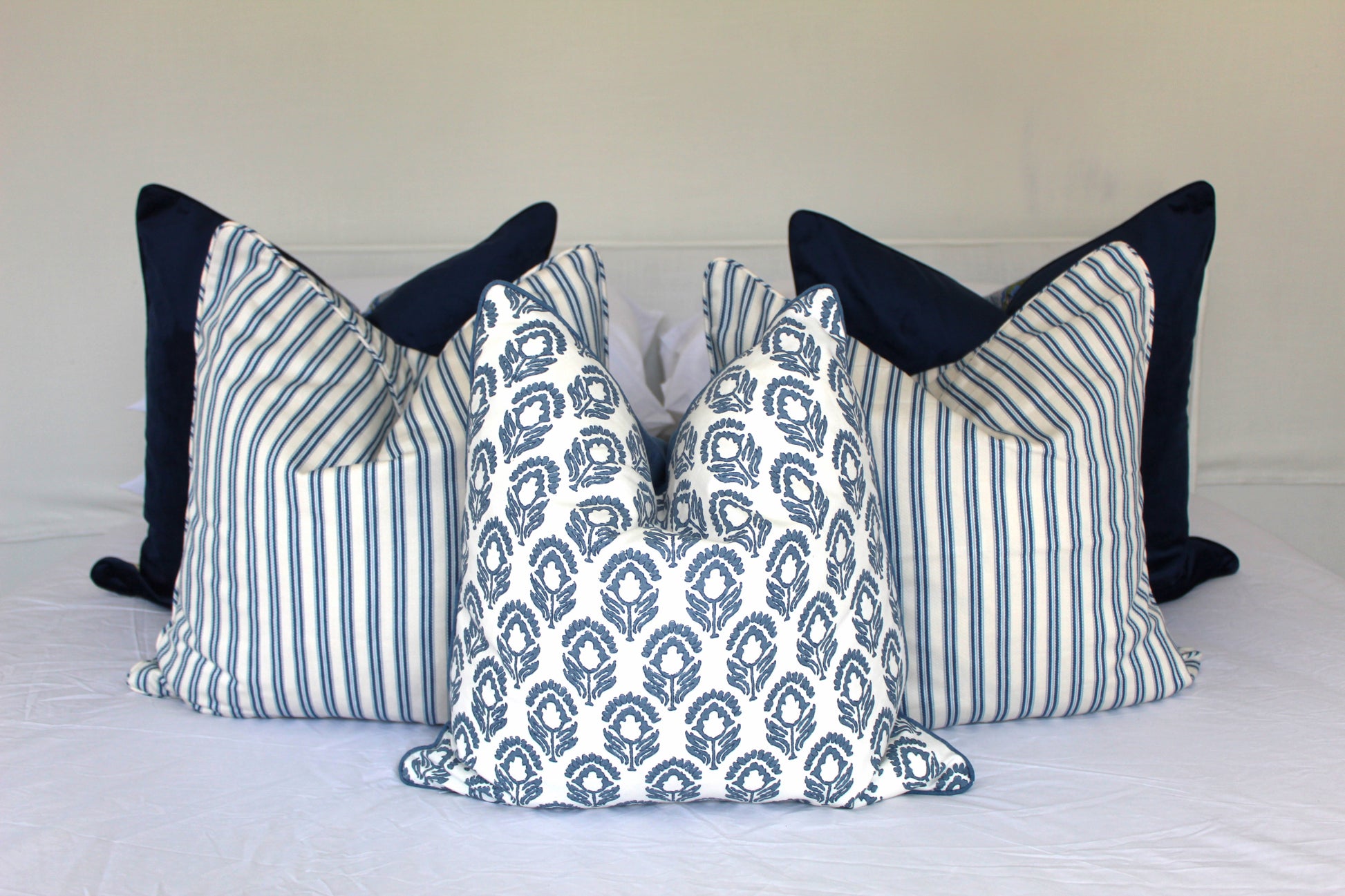 This fabric is a new, stylish addition to a popular designer's range. Composed of 100% cotton, it is extremely soft to the touch and luxurious. It features a white background with denim and sky blue ticking stripes. Each cover is detailed with bias self piping and a zipper at the bottom.