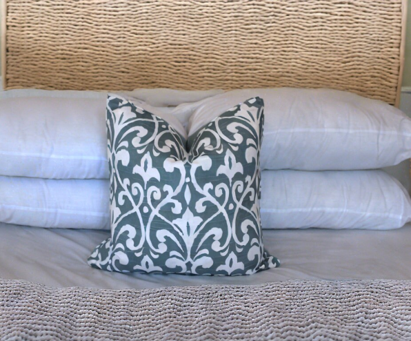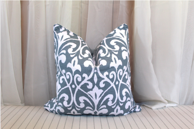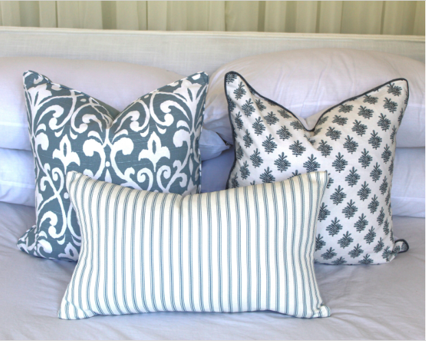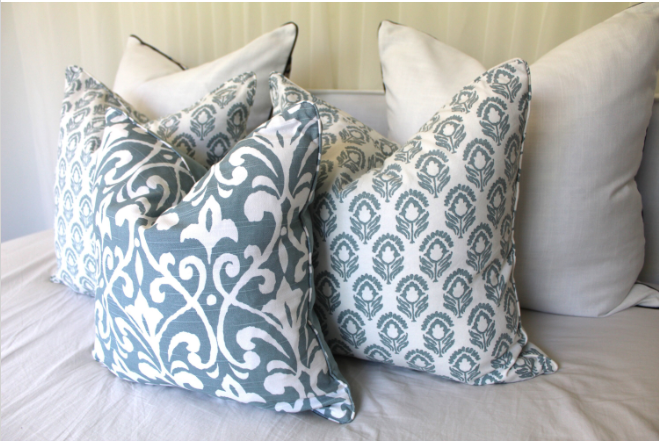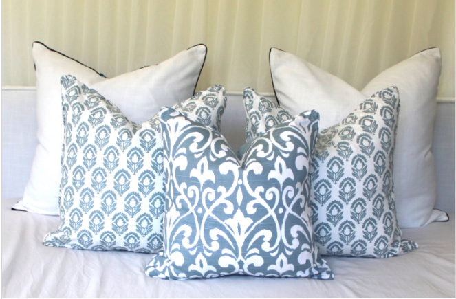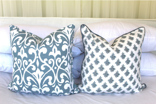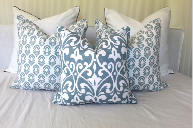 This beautiful fabric has clean super white background and blue print. We centered pattern placement on each cover so each piece is exactly shown in the photos.