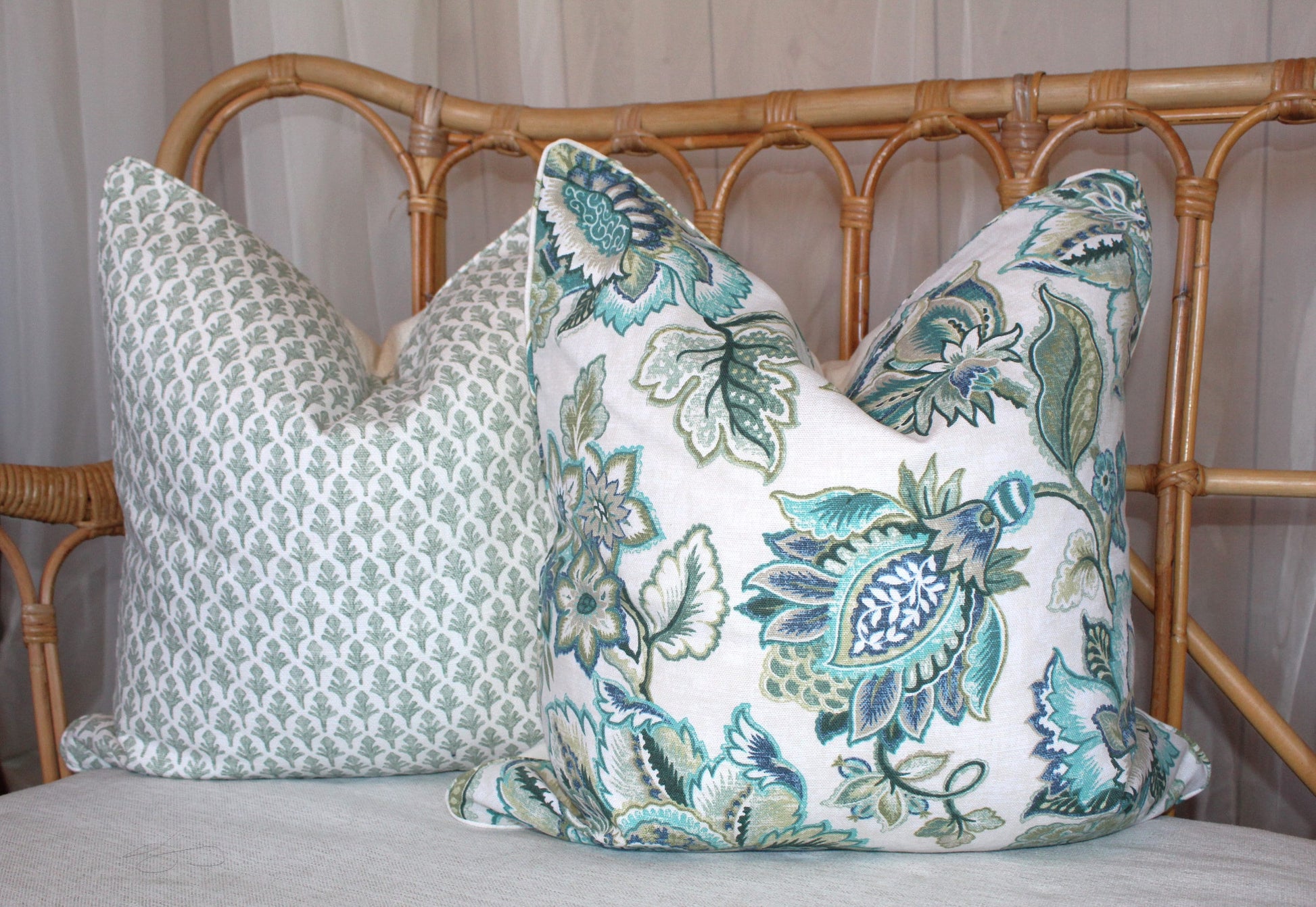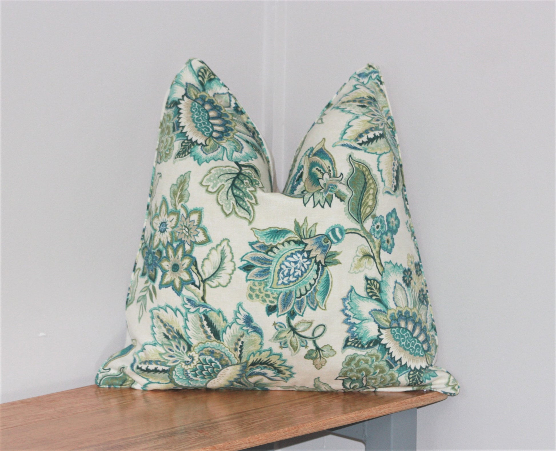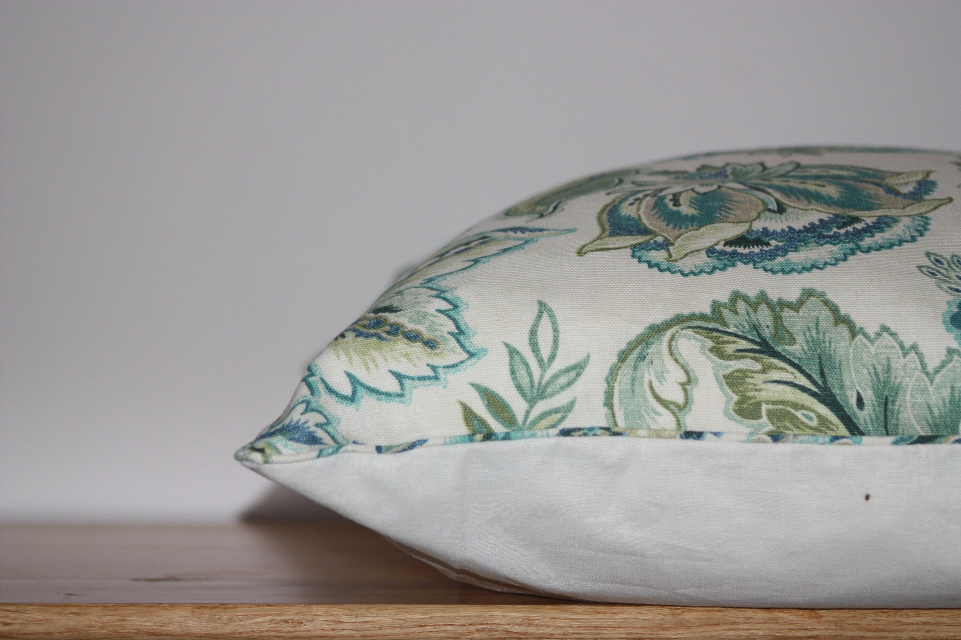 This fabric has shades of cream, taupe and shades of blue and green. Background is cream/off white. Cushion covers are backed with matching beige fabric or you can choose to have both sides floral.