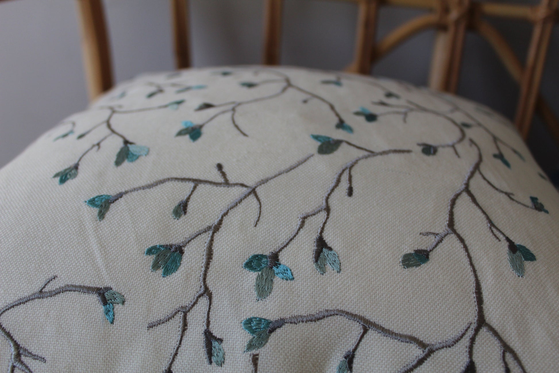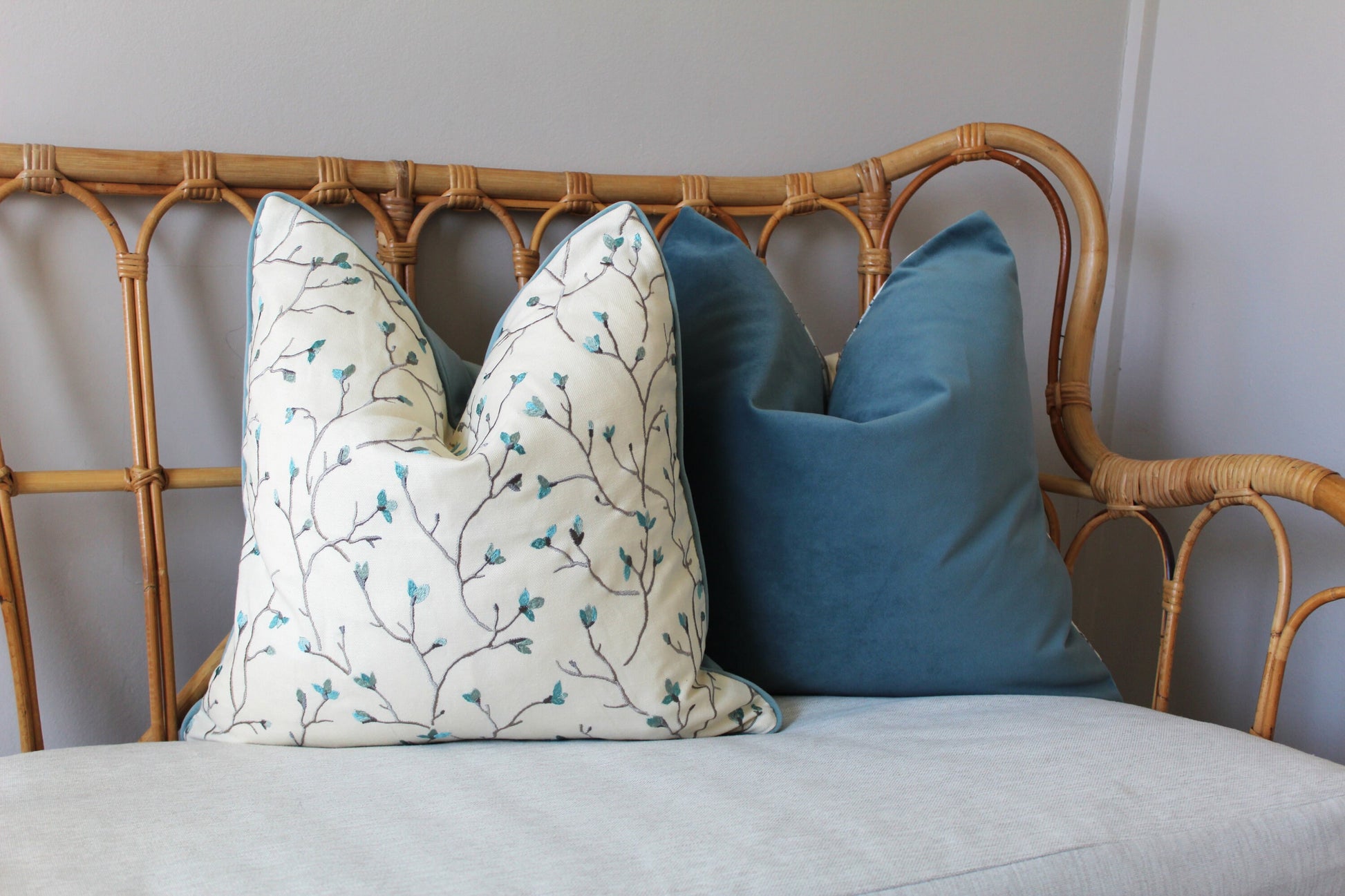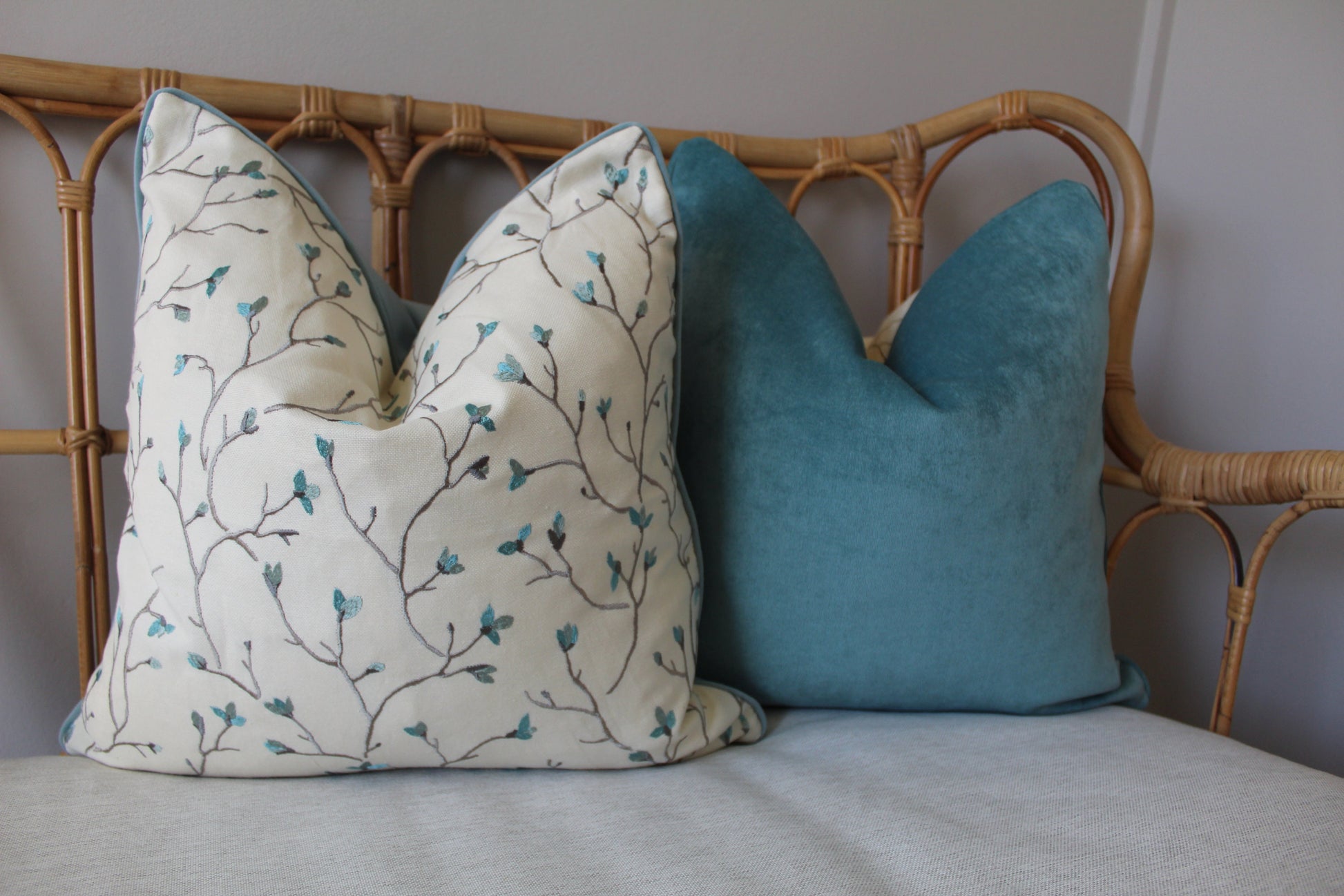 This cover is also available in RED colorway Colors: Ivory, Grey, Aqua Fabric Detail: Woven / Embroidered / Floral Fabric