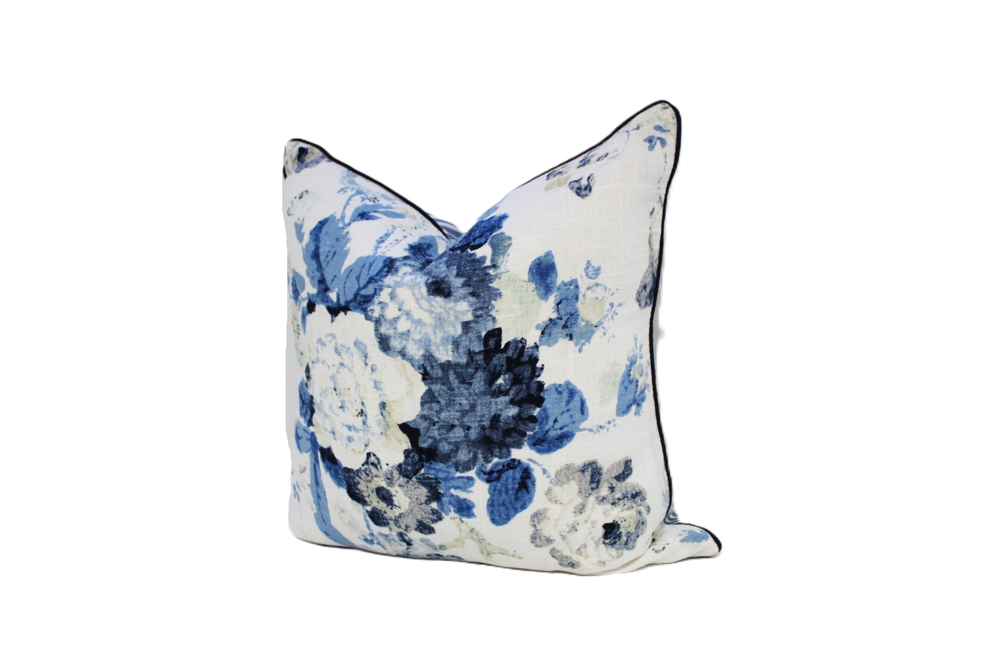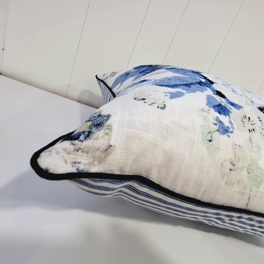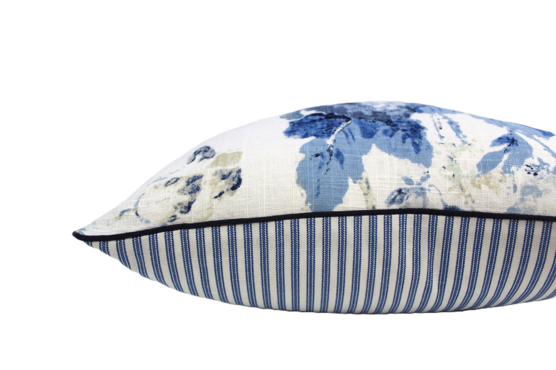 We have sewn navy piping and chosen matching ticking fabric for the back.