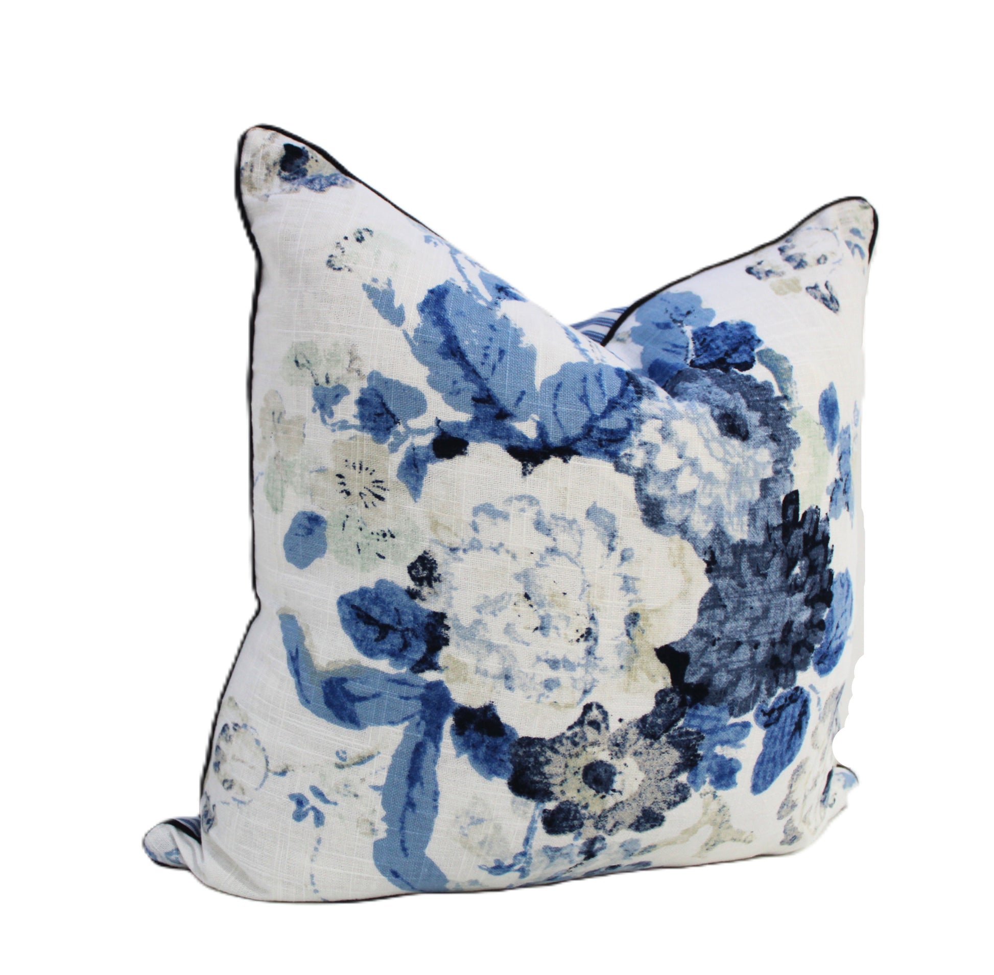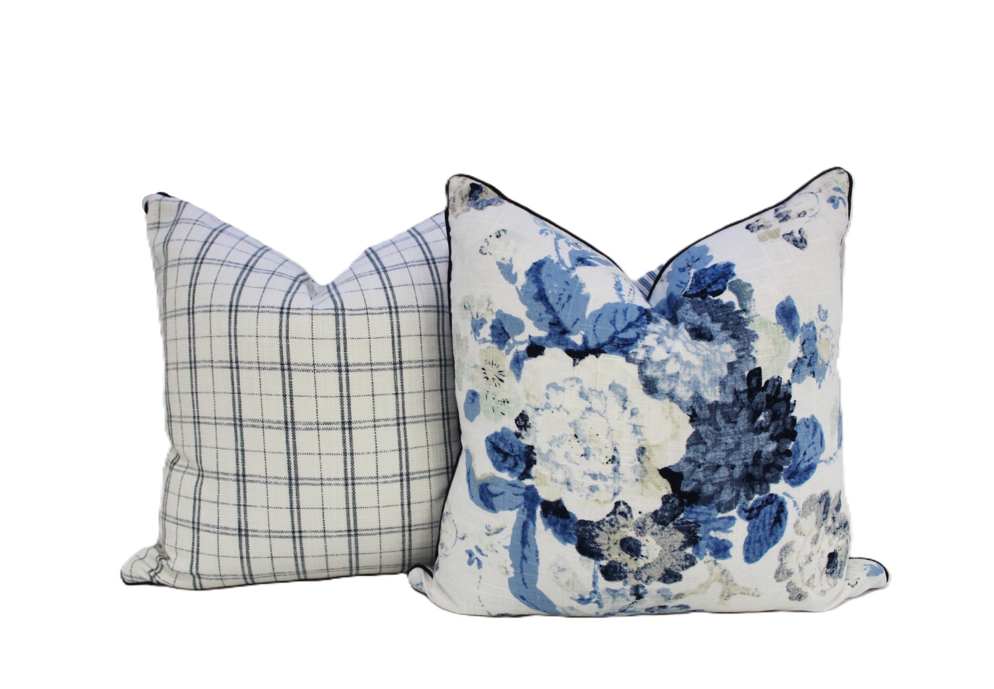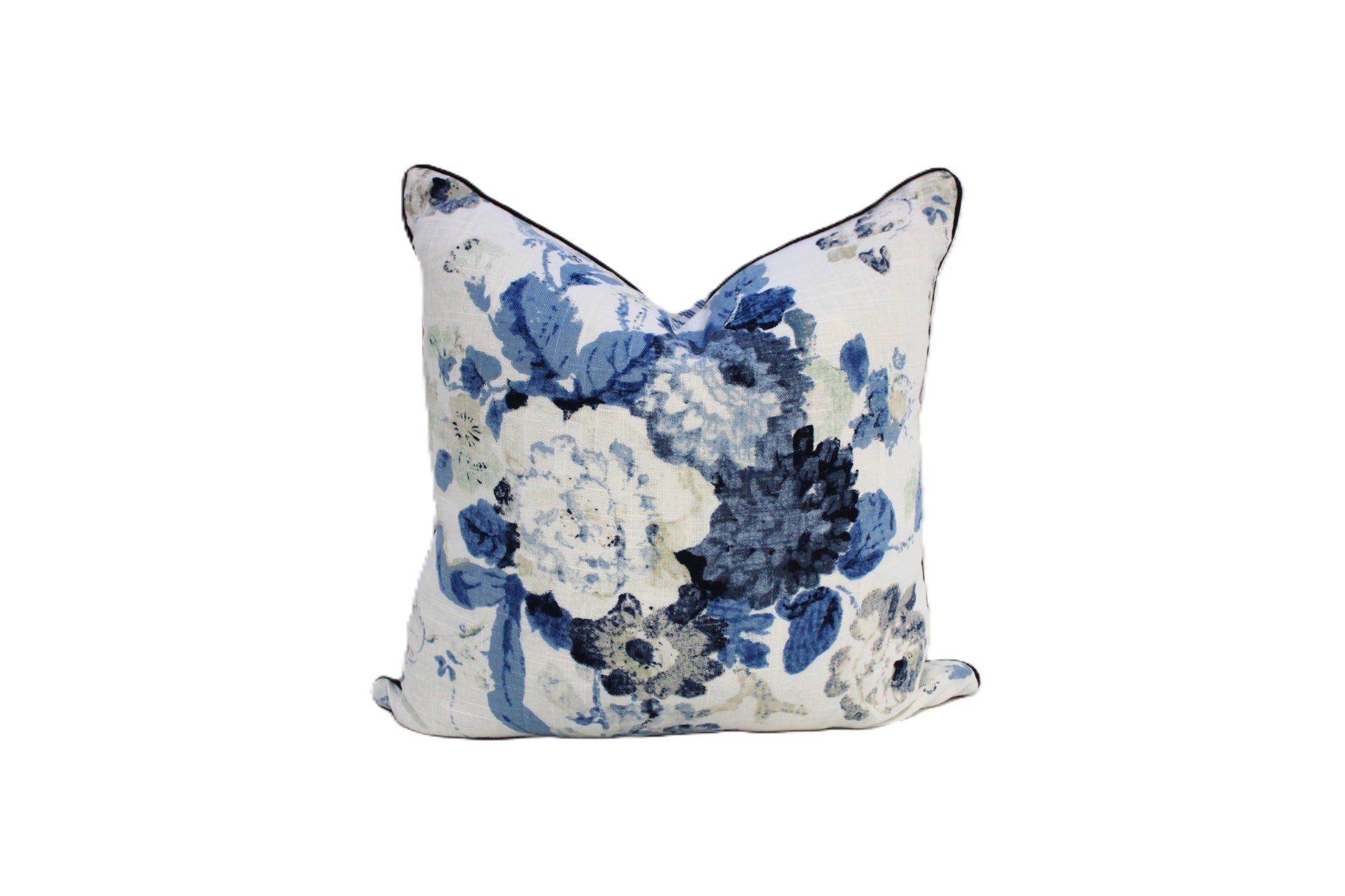 We have sewn navy piping and chosen matching ticking fabric for the back.