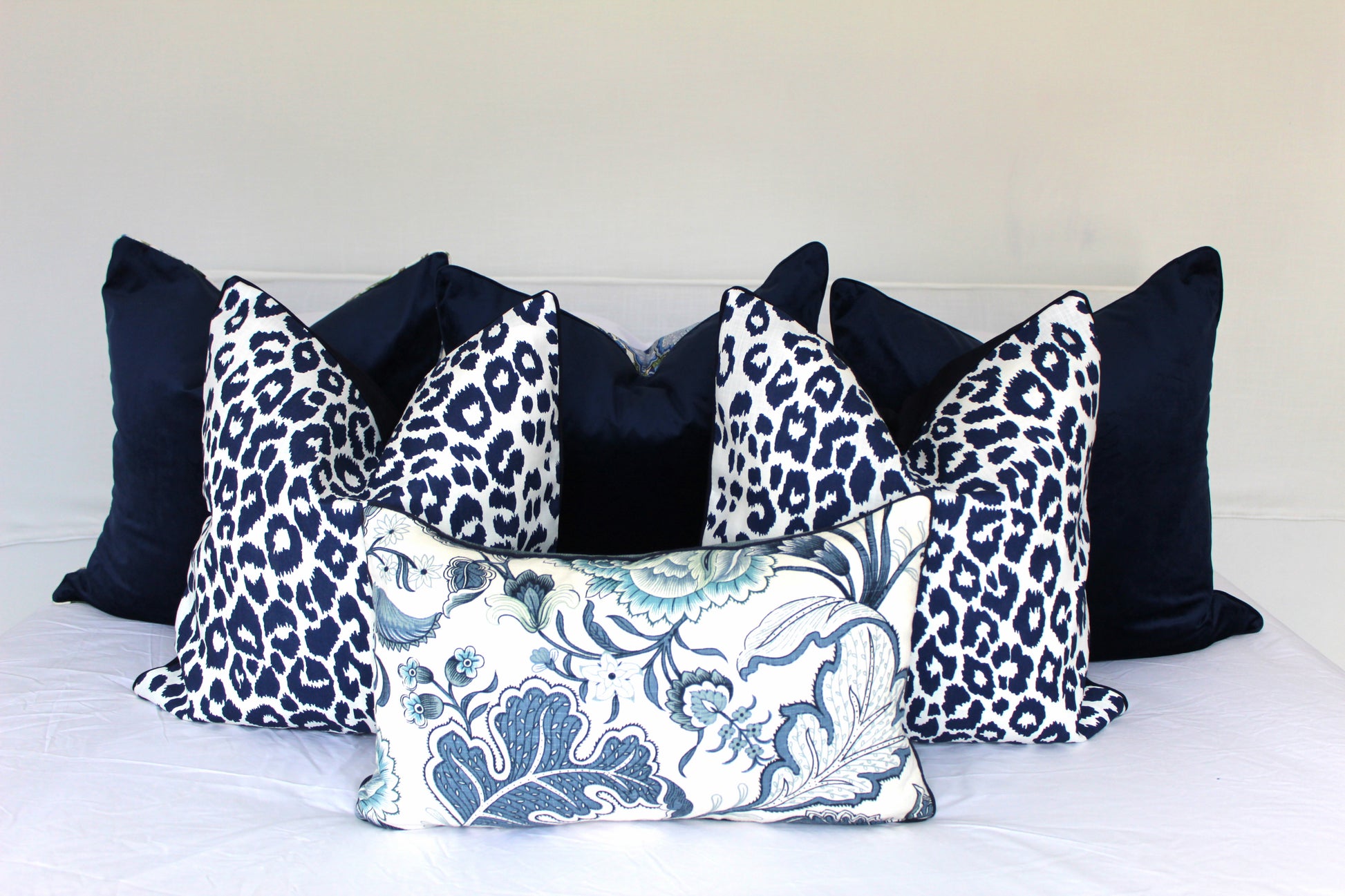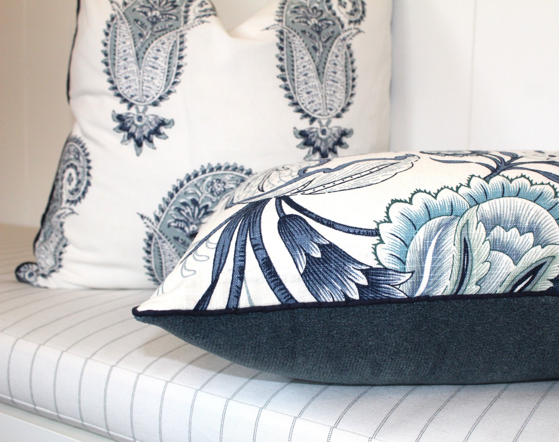This is a beautiful lumbar cushion covers made using last remaining fabric we have. We have used ocean blue velvet from Warwick fabrics as backing and navy fabric for piping.