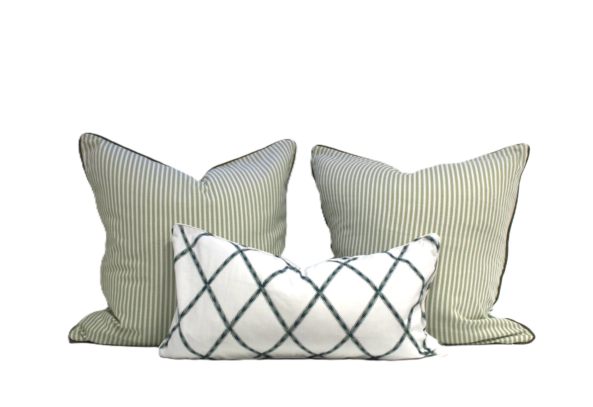 This bundle includes 2 of 60x60 reversible cushions with feather inserts. It has stunning solid sage piping and zipper closure at the bottom. The backing has sage ticking stripe. Priced separately for $145 each for the cover. We have fitted with size 65x65 feather inserts are $55 each