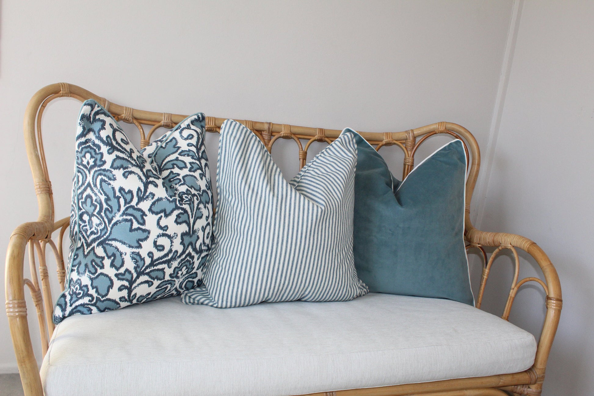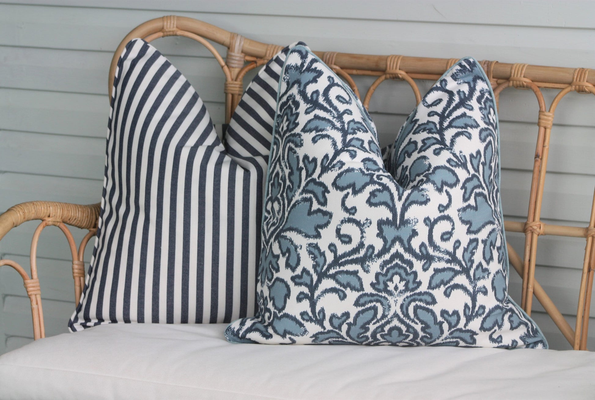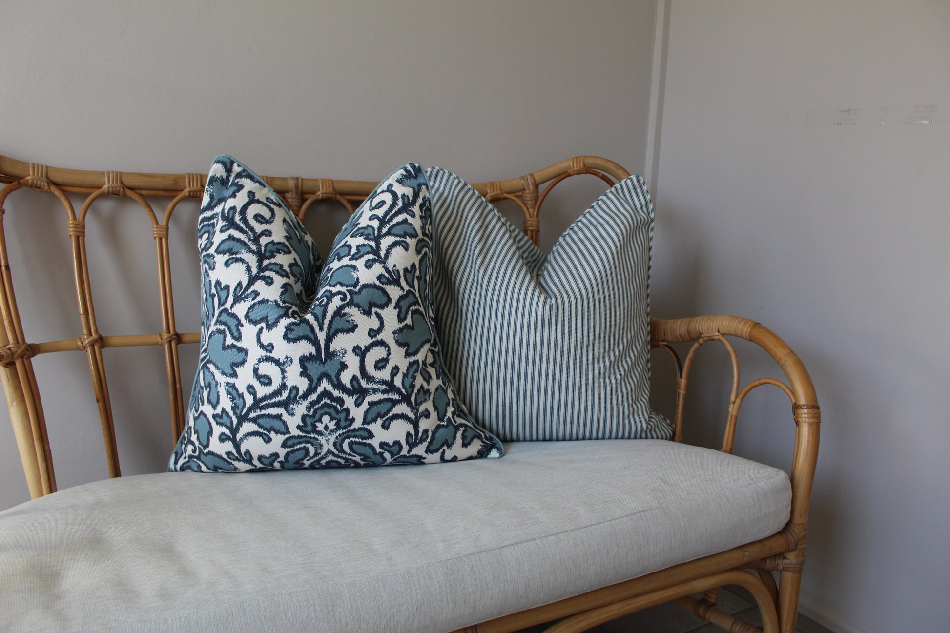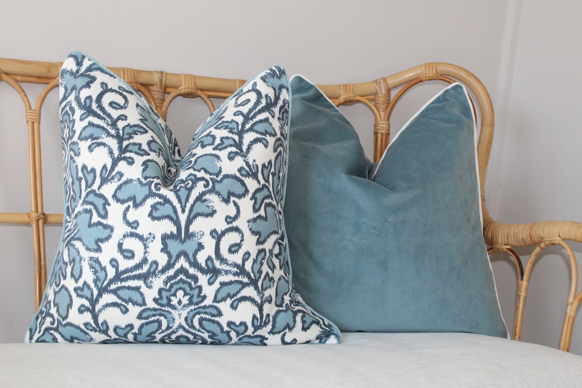 The fabric has shades of navy, duck egg blue and printed on medium weight beautiful canvas. This covers are piped with duck egg blue solid fabric. (That matches perfectly)