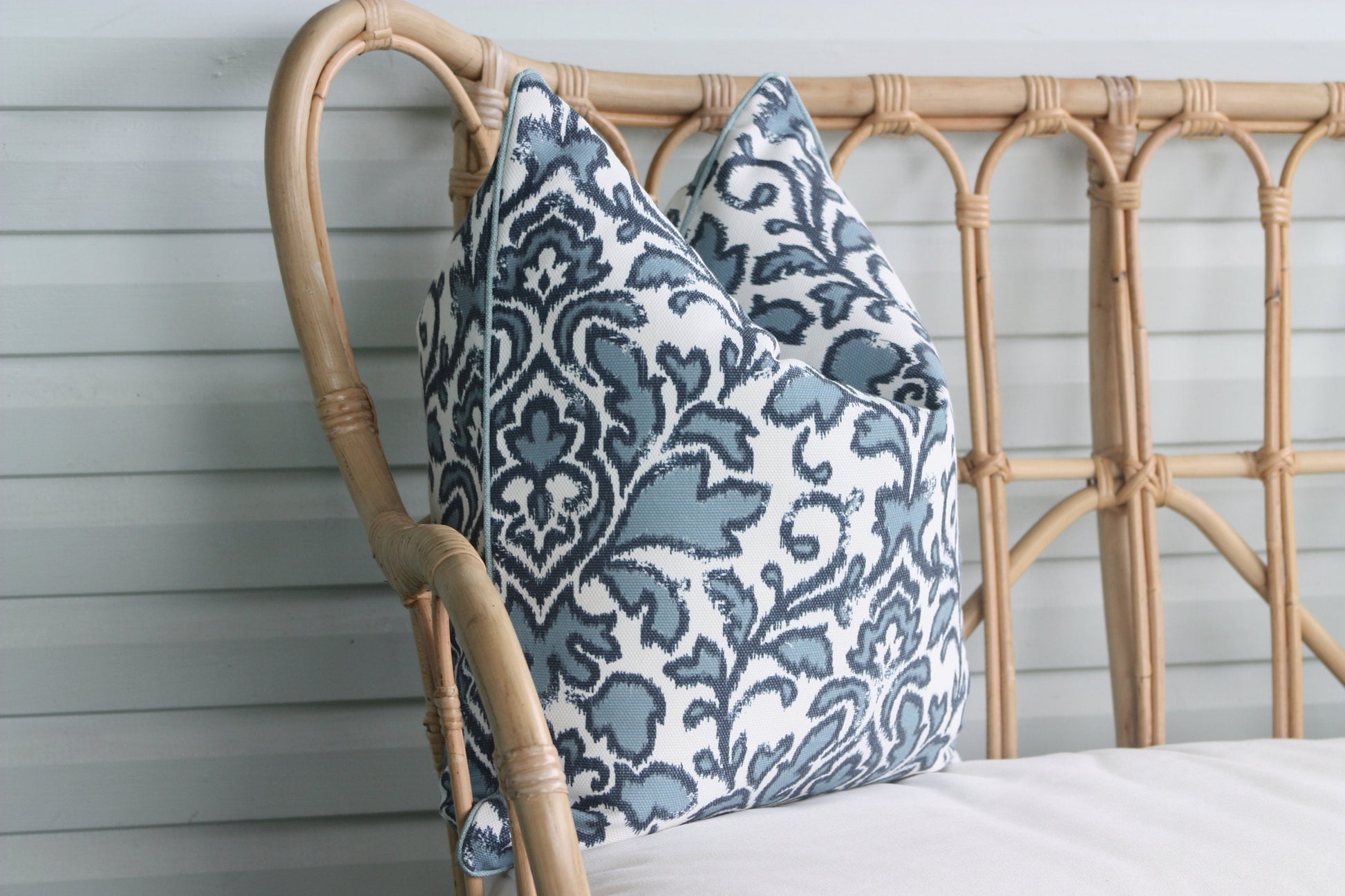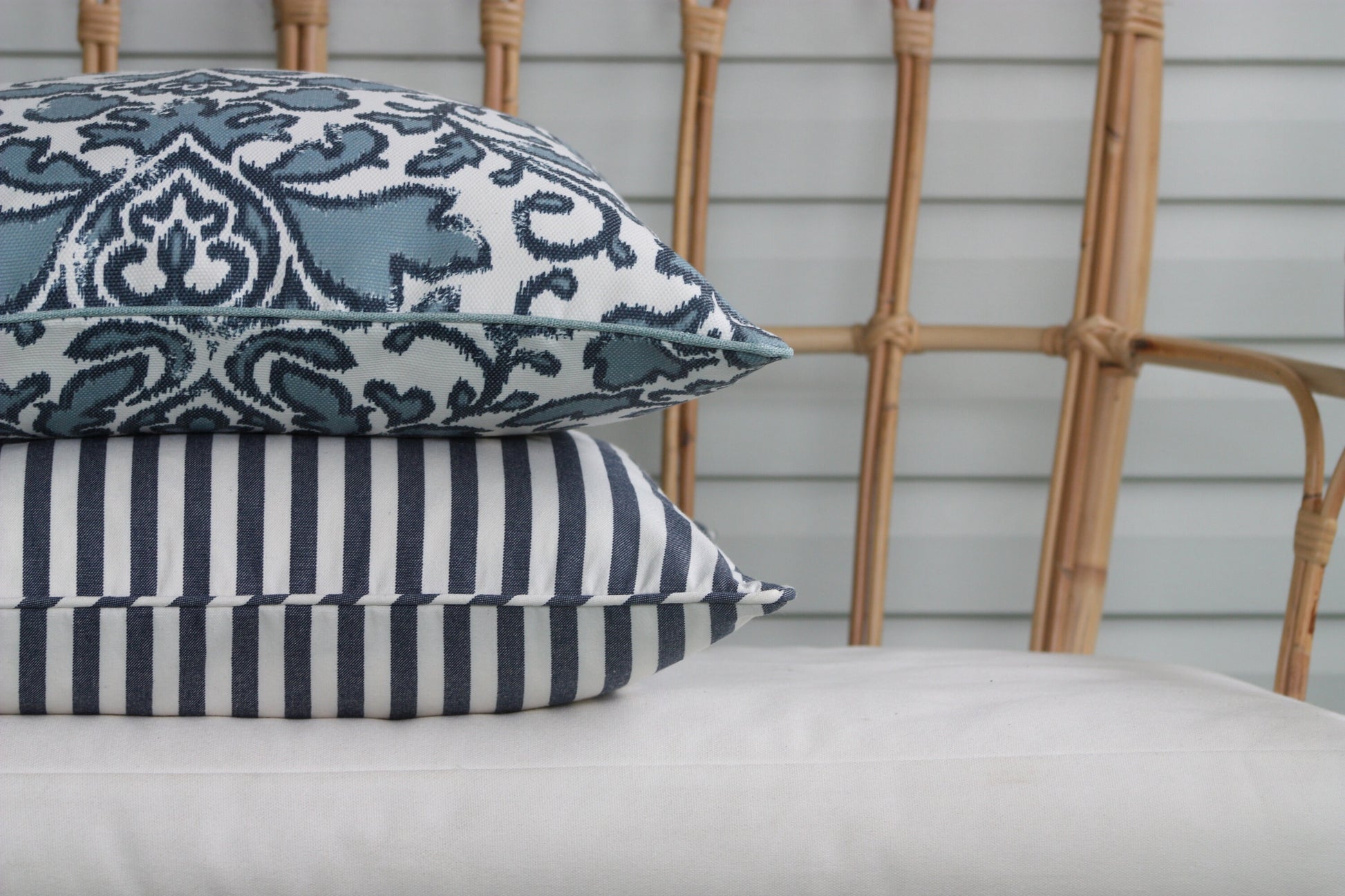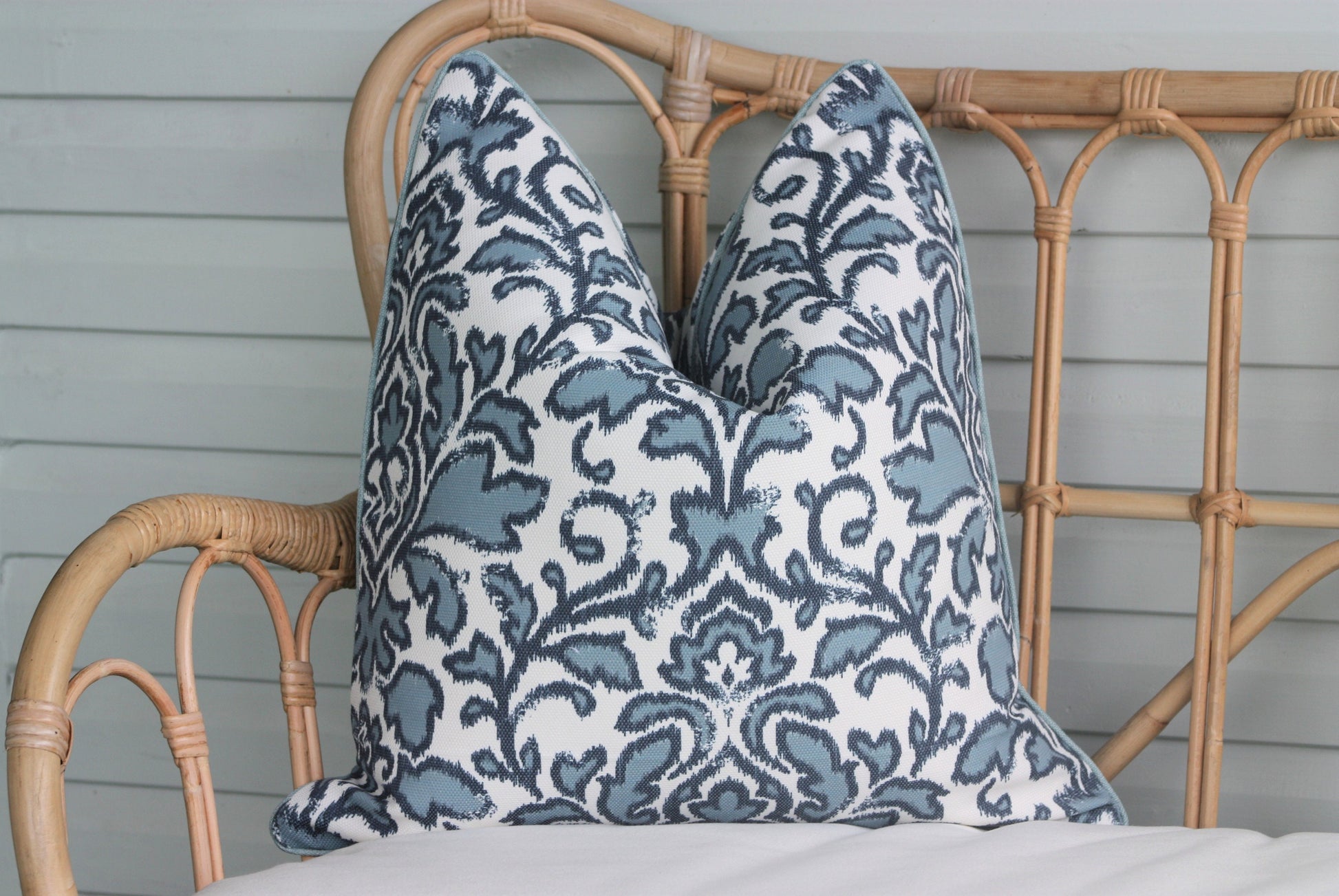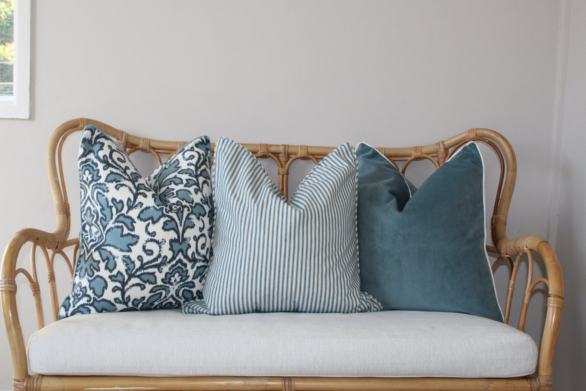 The fabric has shades of navy, duck egg blue and printed on medium weight beautiful canvas. This covers are piped with duck egg blue solid fabric. (That matches perfectly)