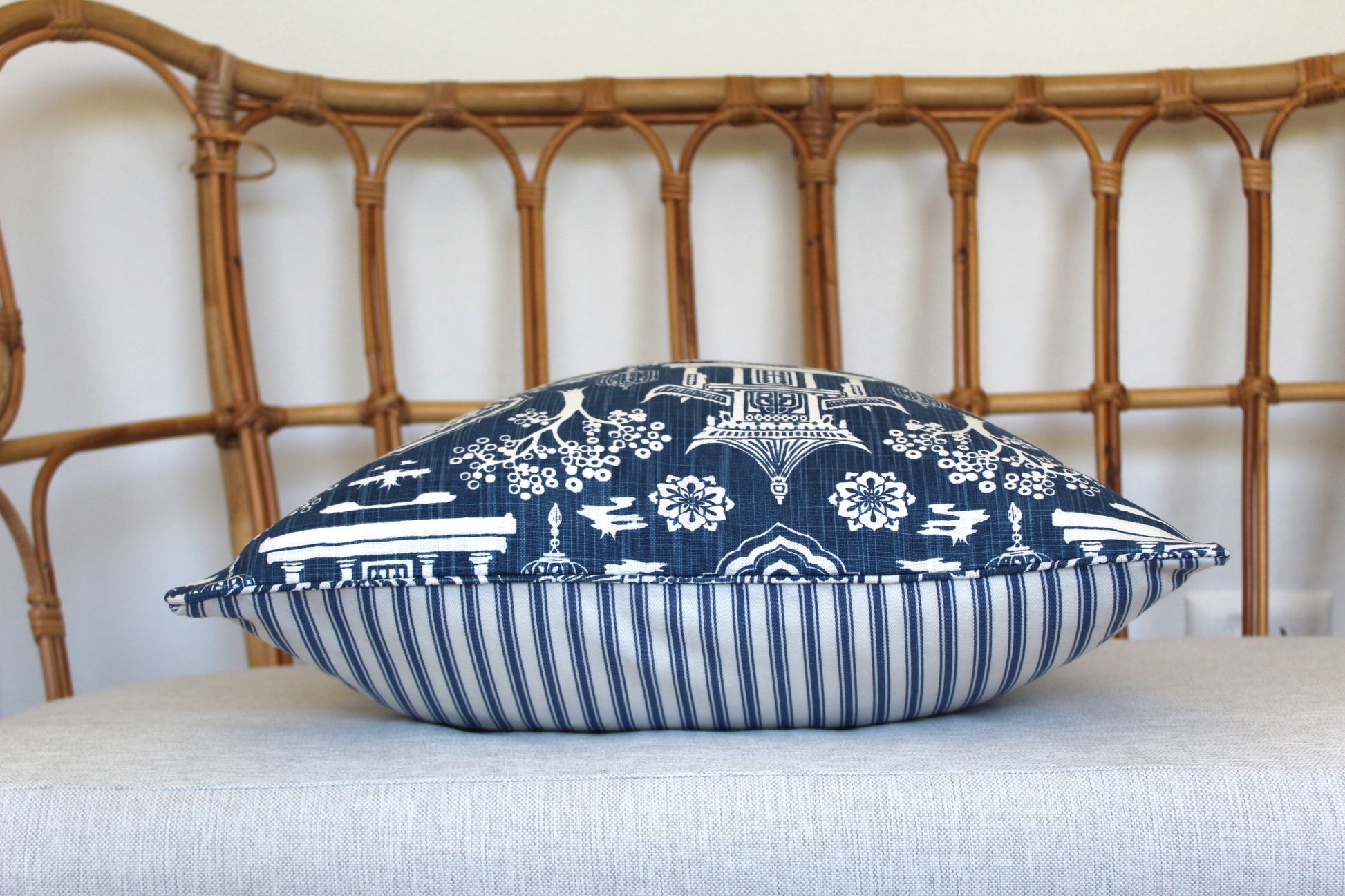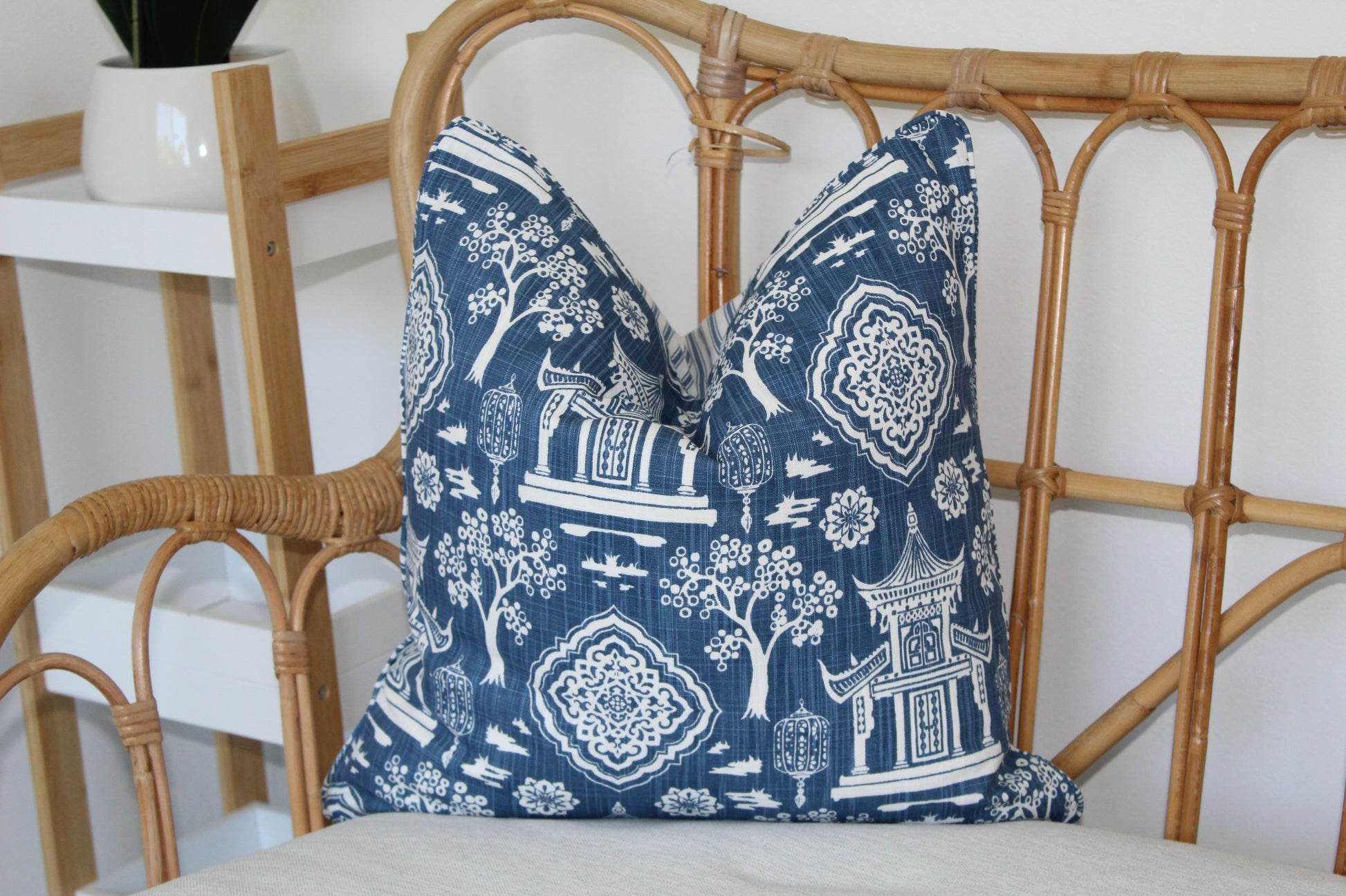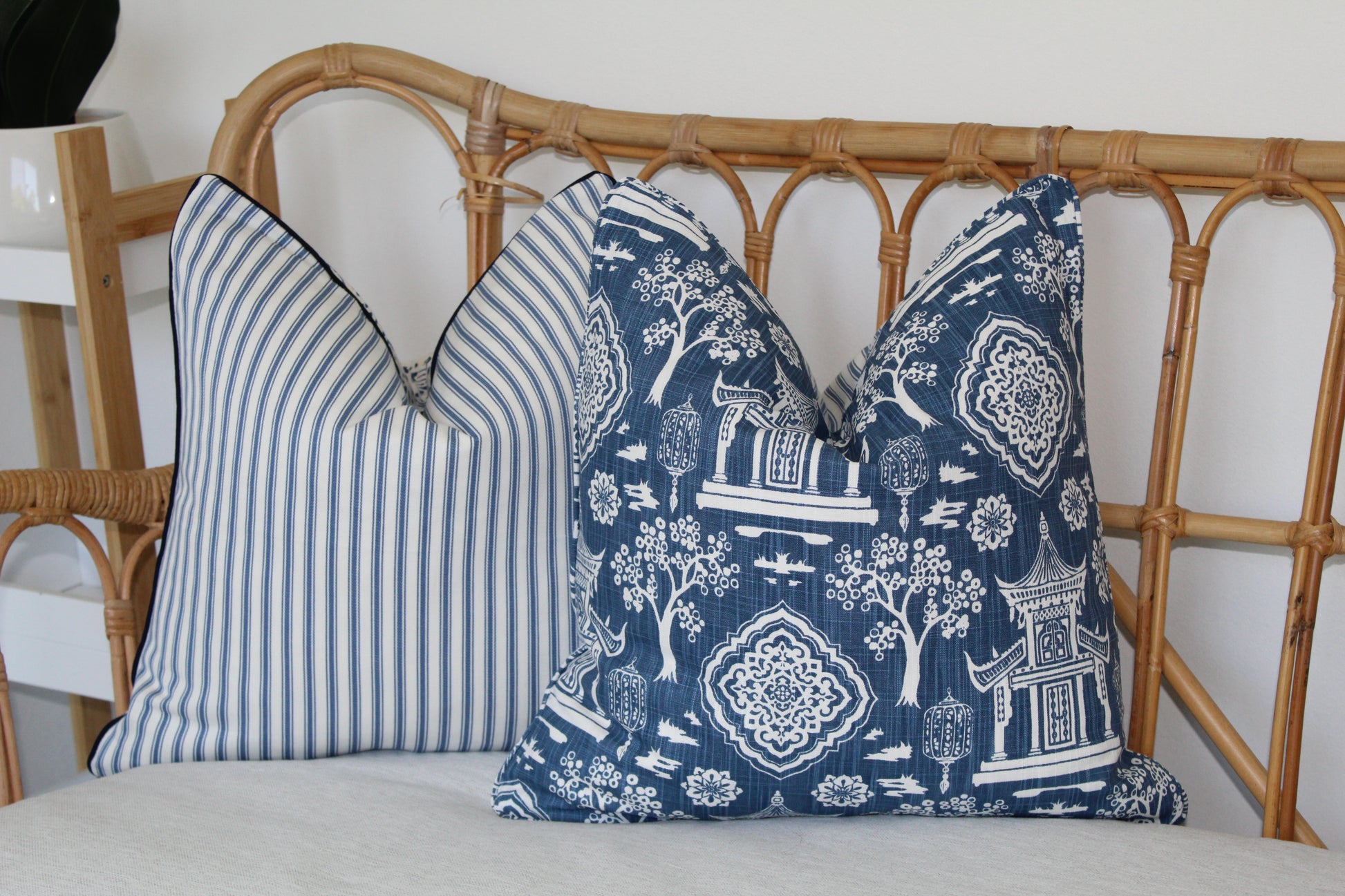 Beautiful and luxurious cushion covers made using Chinoiserie patterned fabric. The background is navy patten with whitish texture.