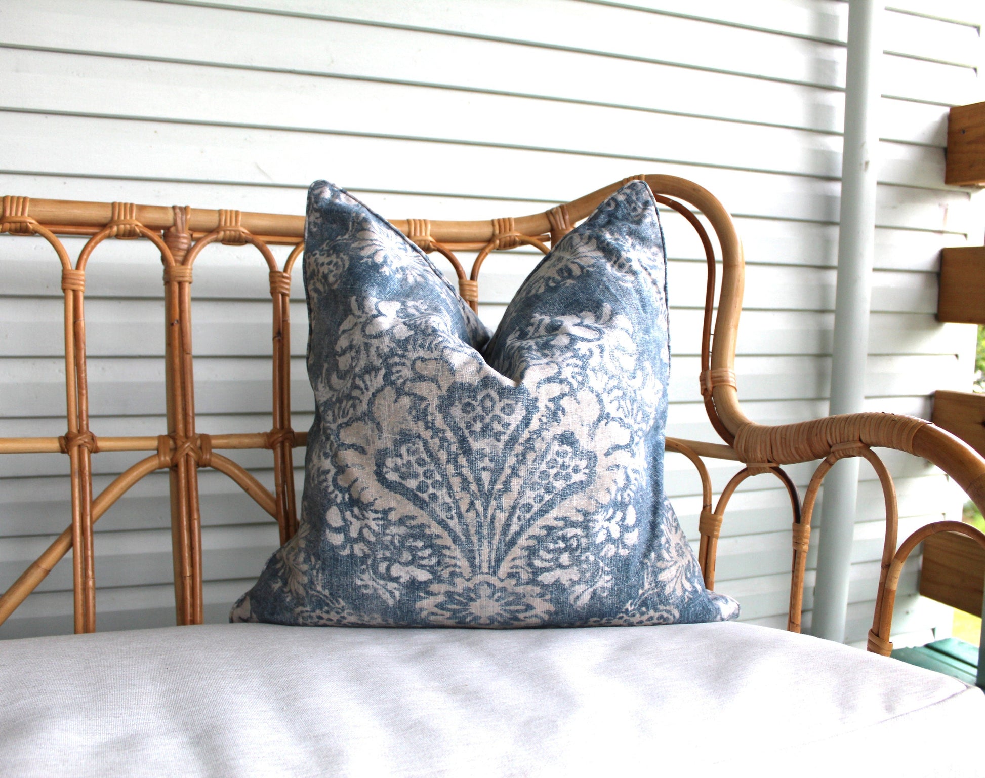 Crafted from 100% cotton with soft tones and a dusty denim shade on a creamy off-white background, the ones shown in photos measure 50x50 or 20" in size.