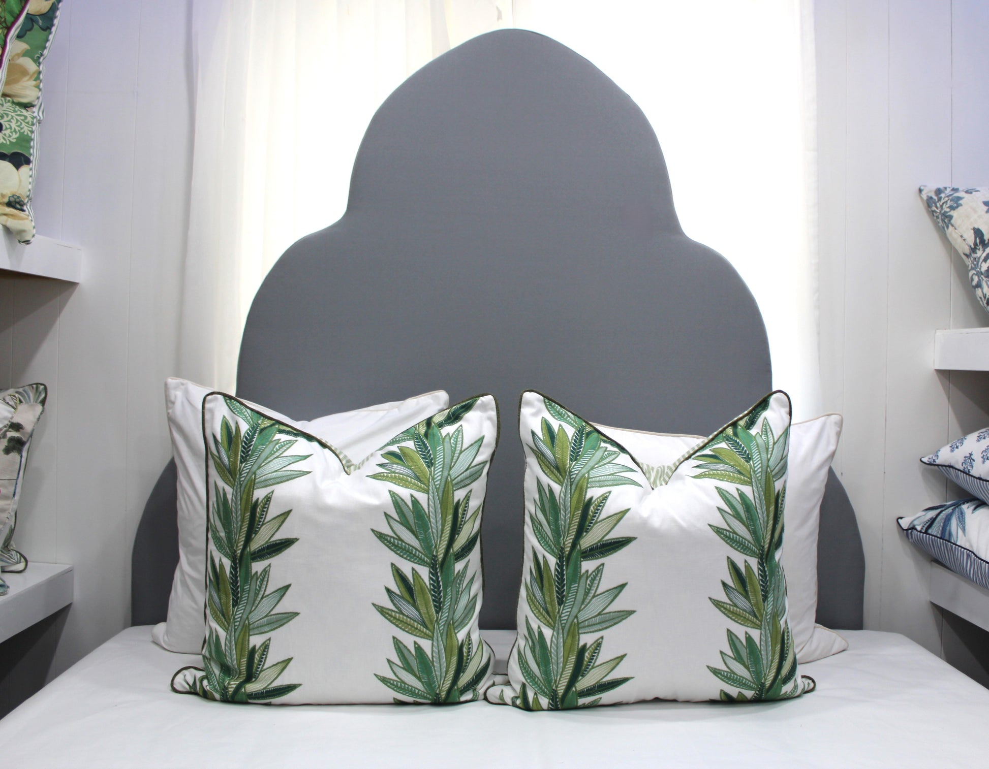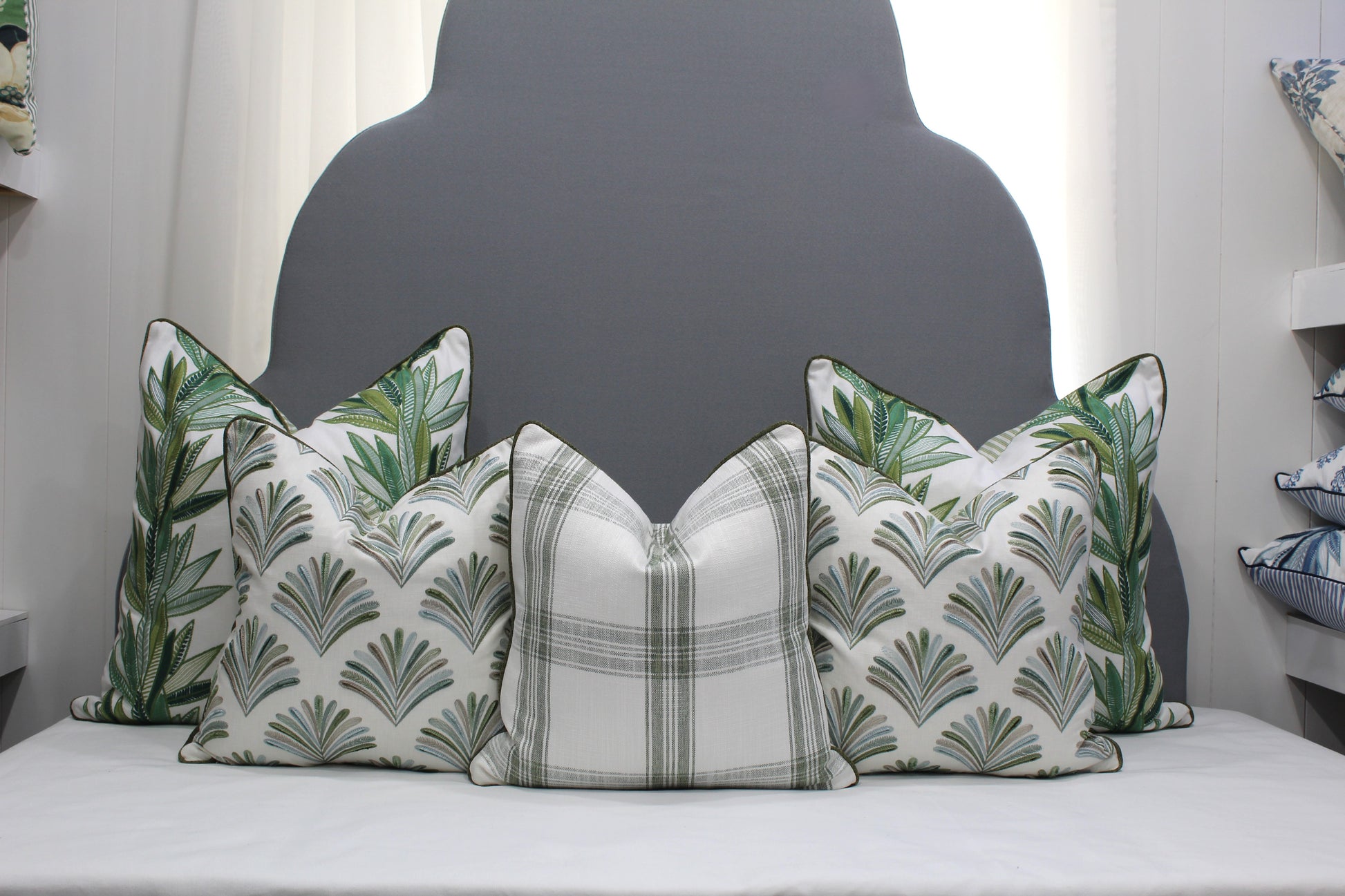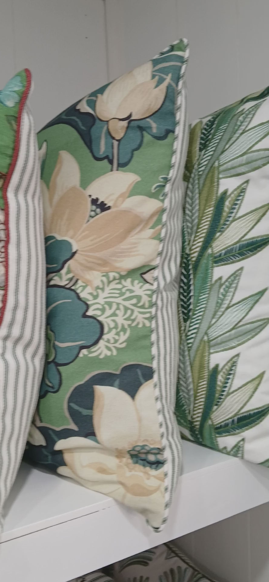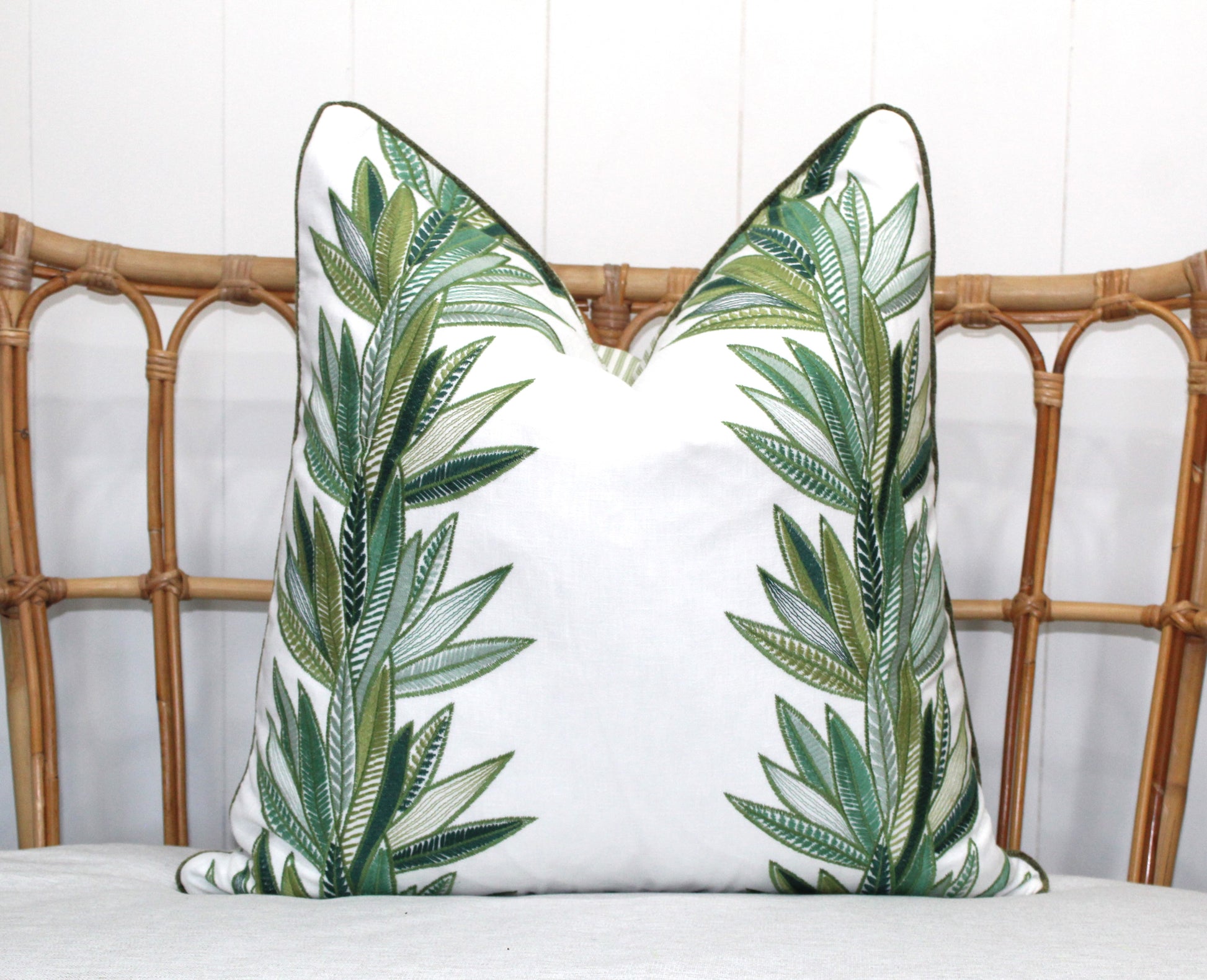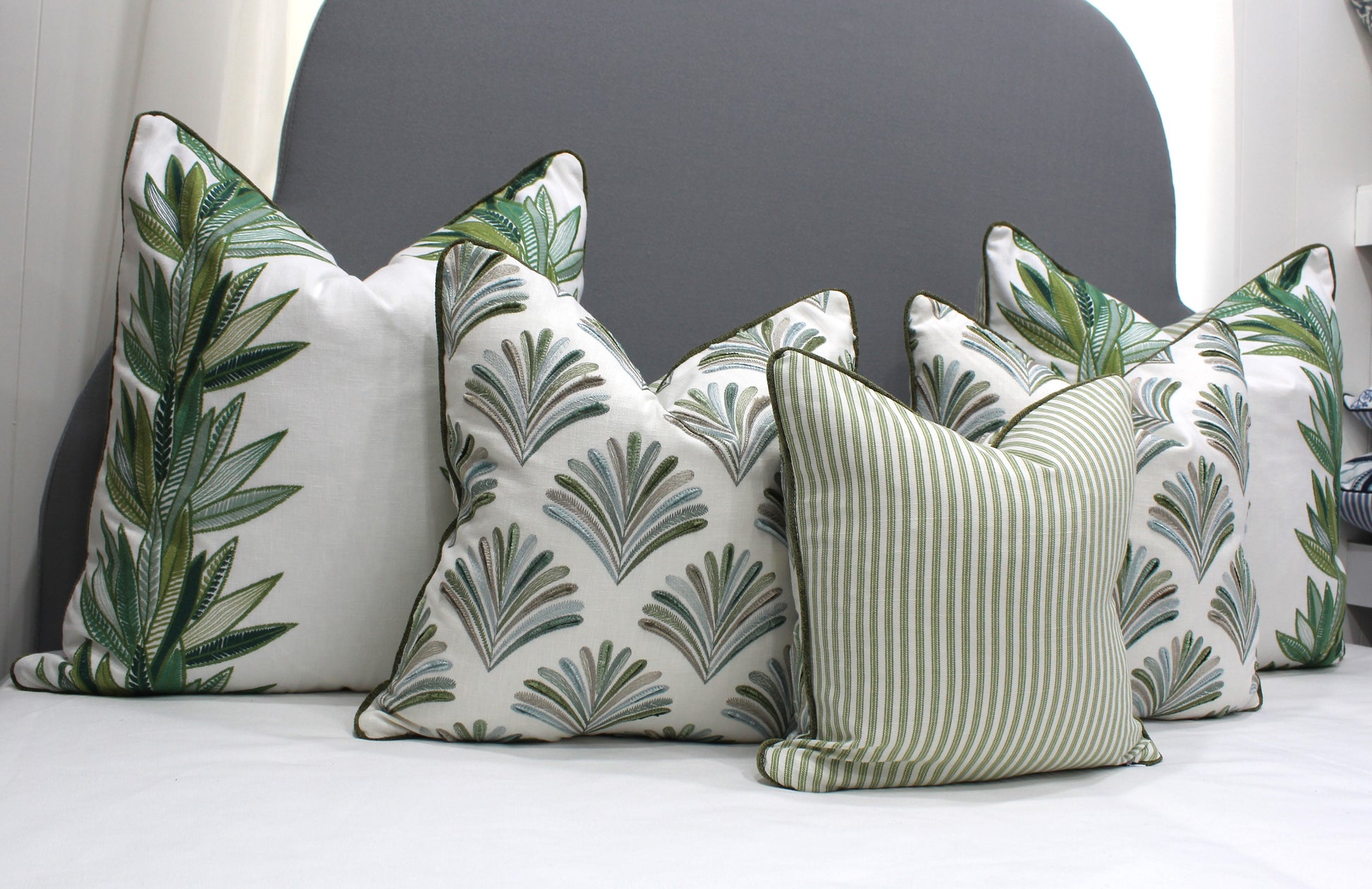 This fabric is new to P Kaufmann range, and we have sewn it into beautiful cushion covers. The background fabric is crystal white with linen feel and embroidered beautifully in green and sage colors