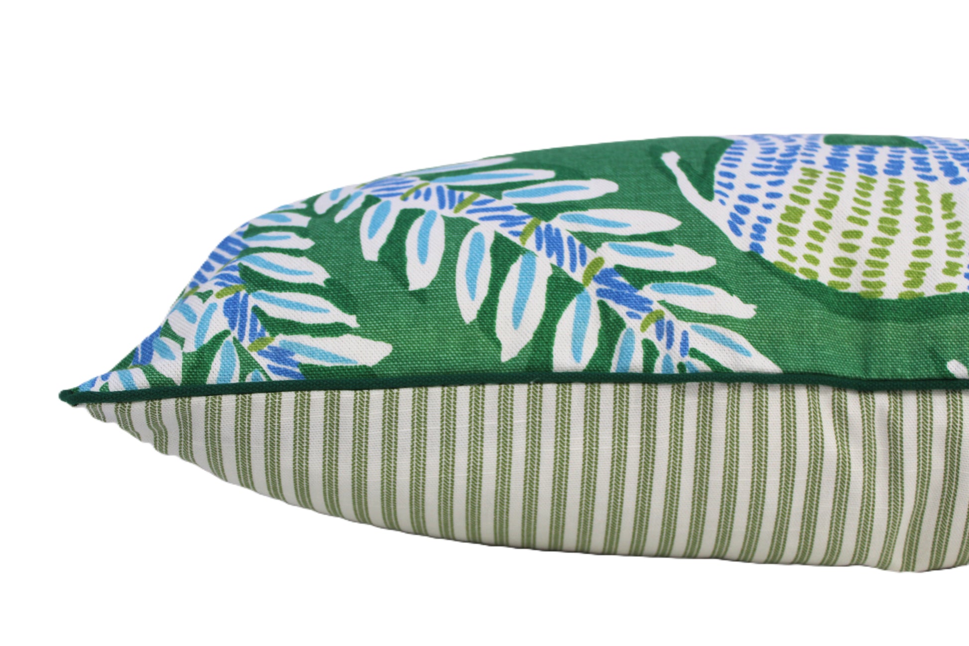 Additionally, the cushion features a stripe on the back as well as dark green piping.