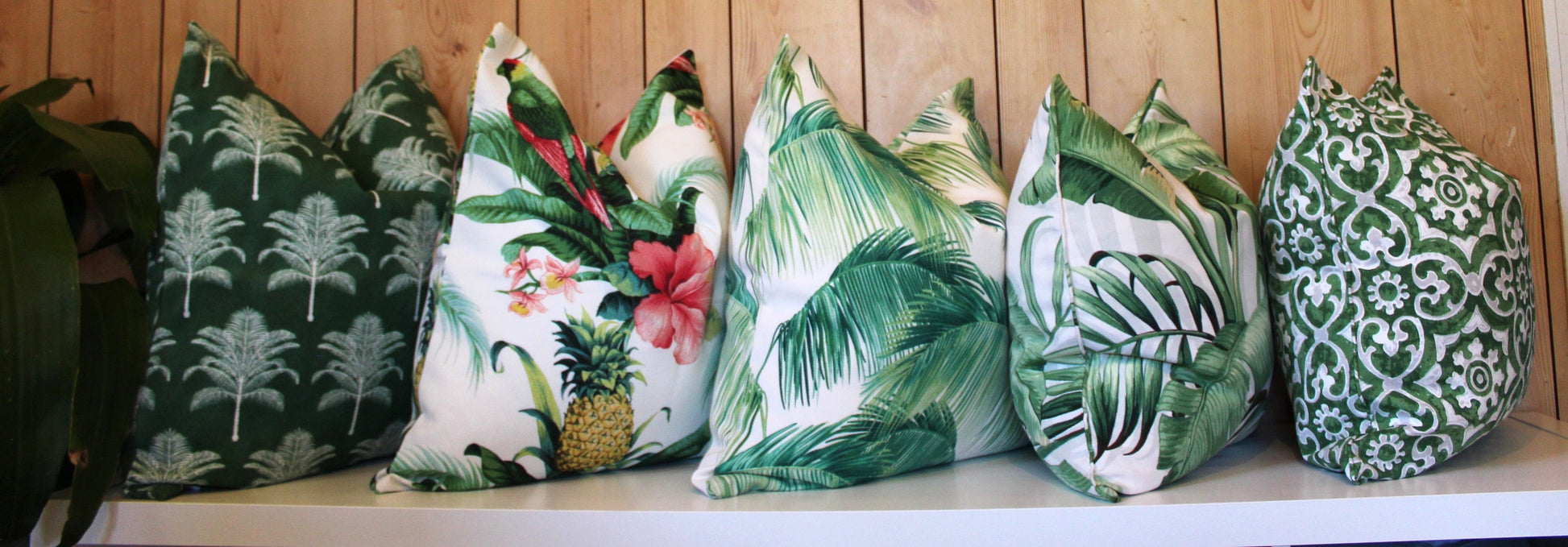 3rd Cushion = Large leaves This Fabric is from also Tommy Bahama range. It's suitable to use both indoor and outdoors. All sizes available
