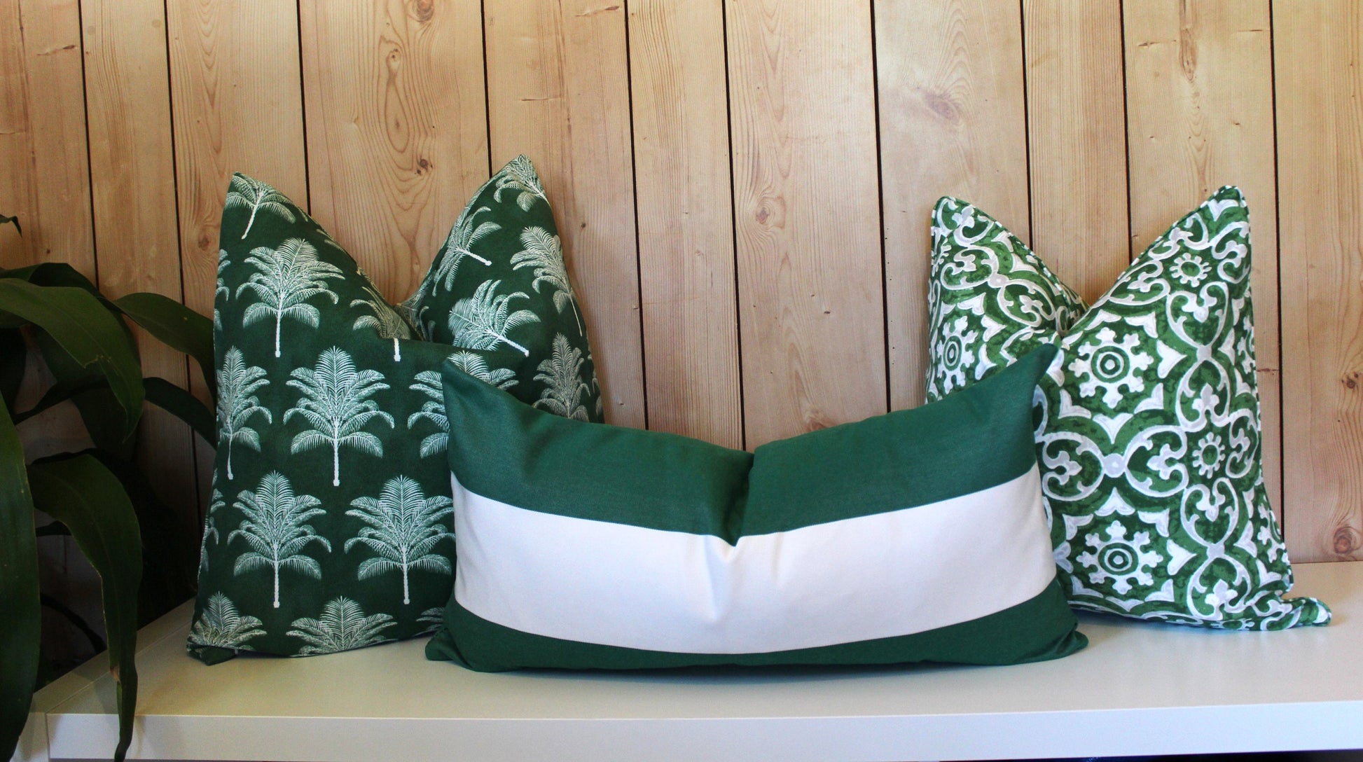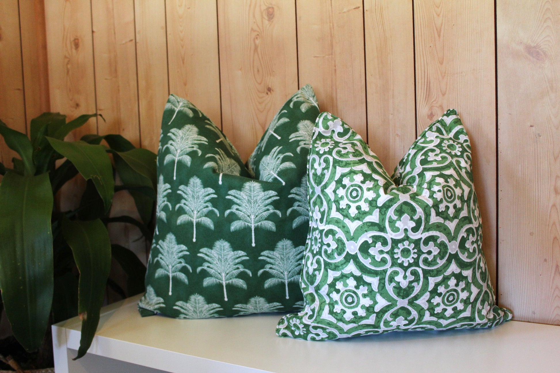 1st cushion = Pine Tree fabric This fabric is from Tommy Bahama, suitable to use both indoor and outdoor purposes. It has beautiful vibrant green background and pine trees are in white shade. All sizes available