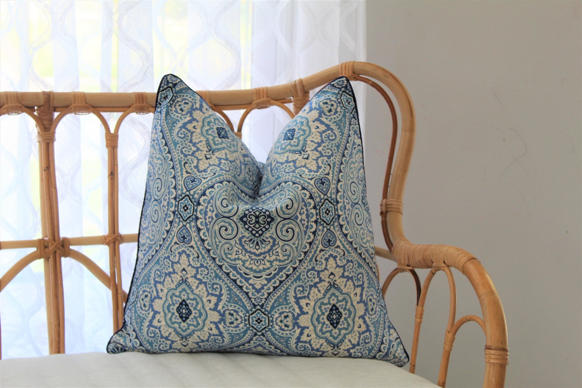 Beautiful and exotic pattern with navy, blues, and creamy off whites. This large damask pattern fabric is imported from US and made into beautiful cushion covers with pattern centered on all covers.