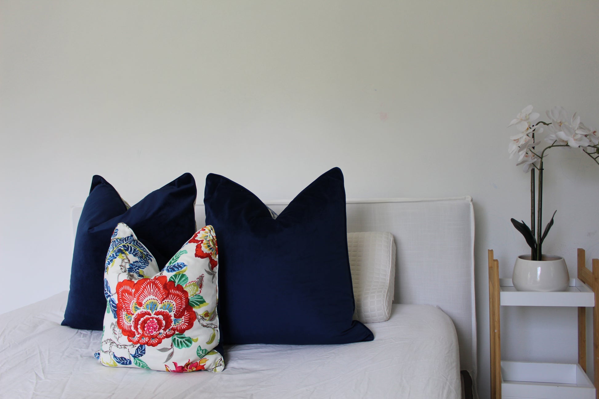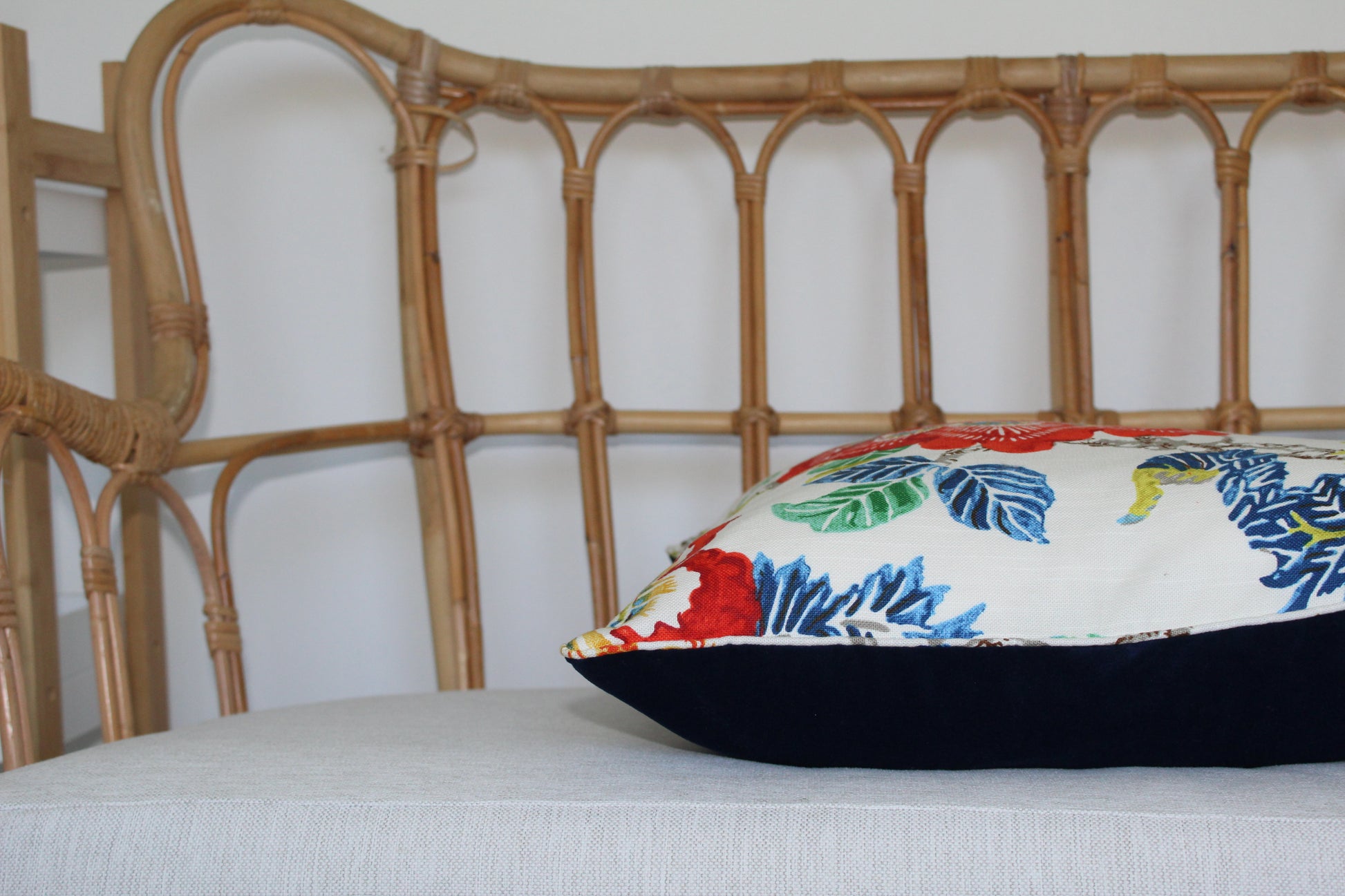 It has self piping and have navy velvet backing. Navy zipper at bottom so you can easily remove it for cleaning purposes.