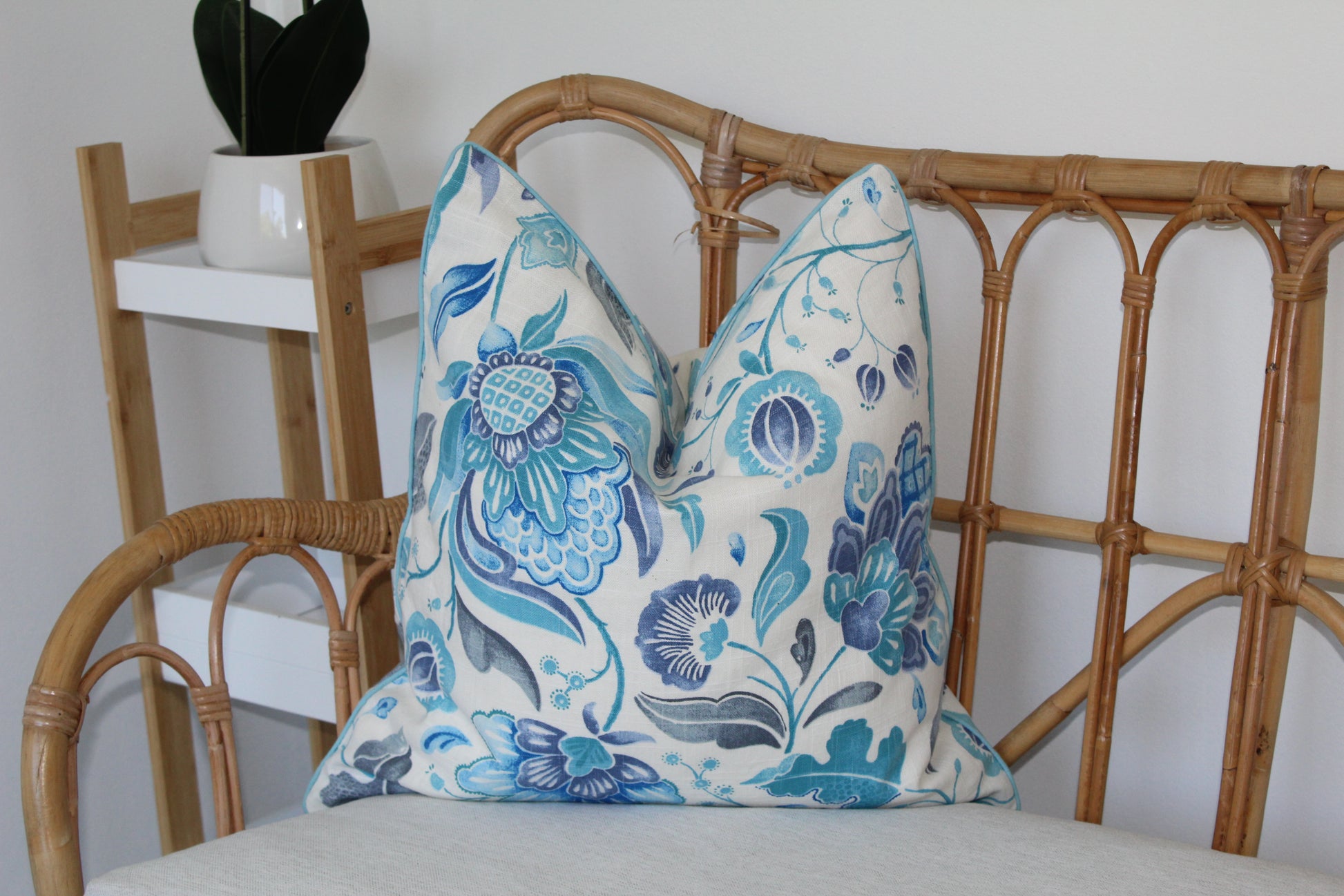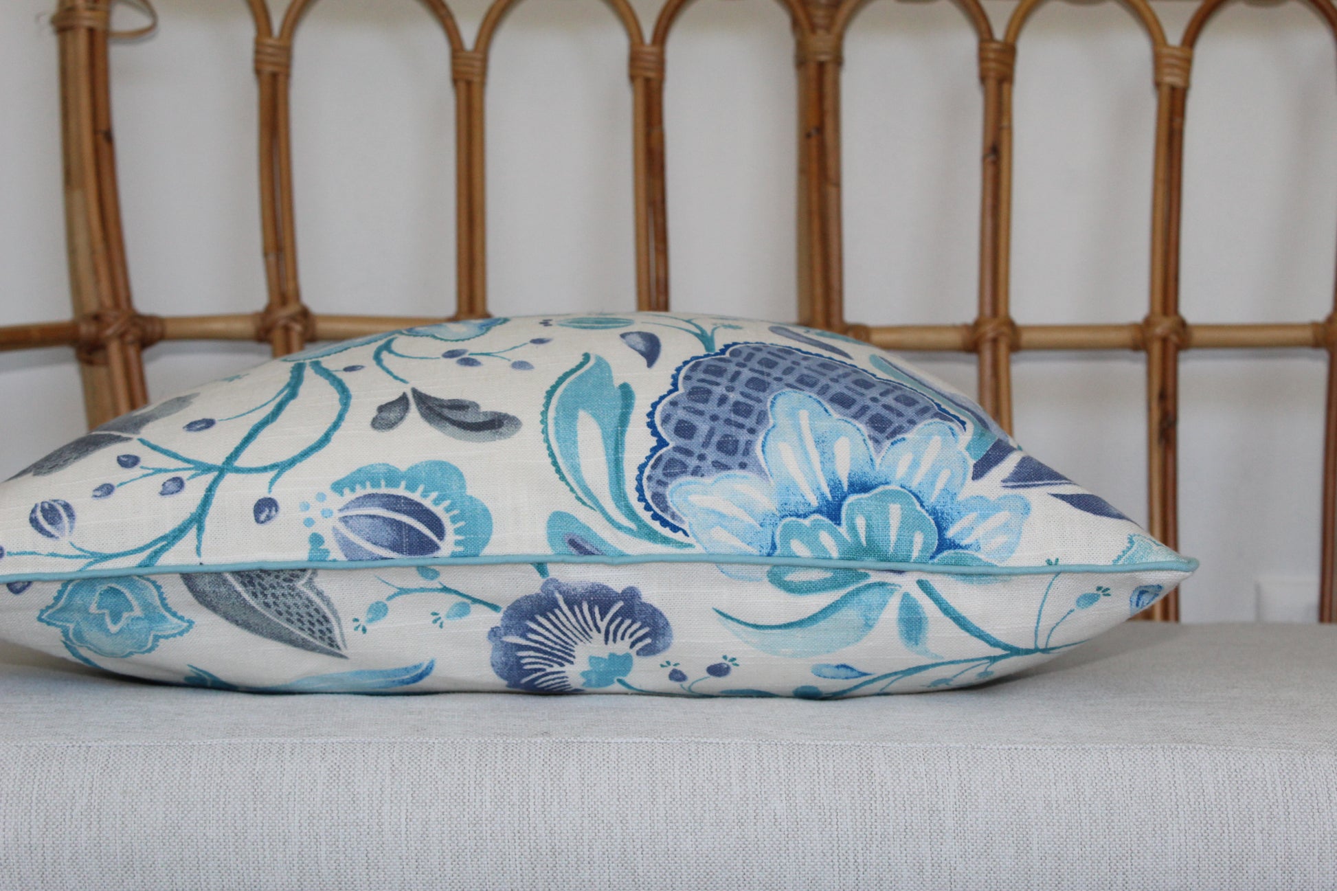 It has beautiful shade of duck egg and sky blue color combination. This cover has same fabric on both sides. Piped in matching blue.