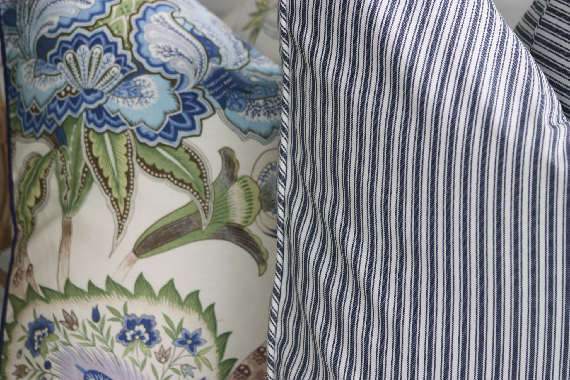 3. Backed with stripes = one side floral, other side stripe making the cushion reversible. With navy piping.