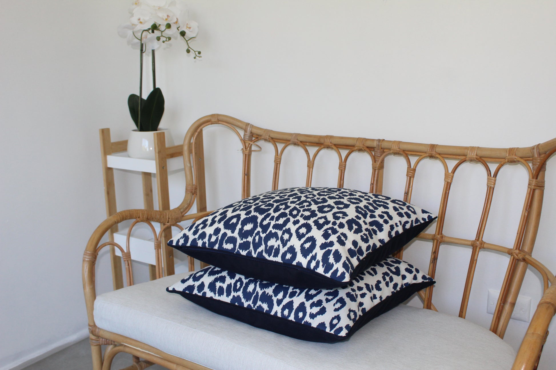 This pair of beautiful high end quality cushion covers are made using Schumacher Leopard print at front and backing and piping are with Sunbrella Navy fabric. Size of the covers are 50x50. Both fabrics are used are suitable for both indoor and outdoor used. Priced for the pair of 50x50 covers. Inserts are not included.