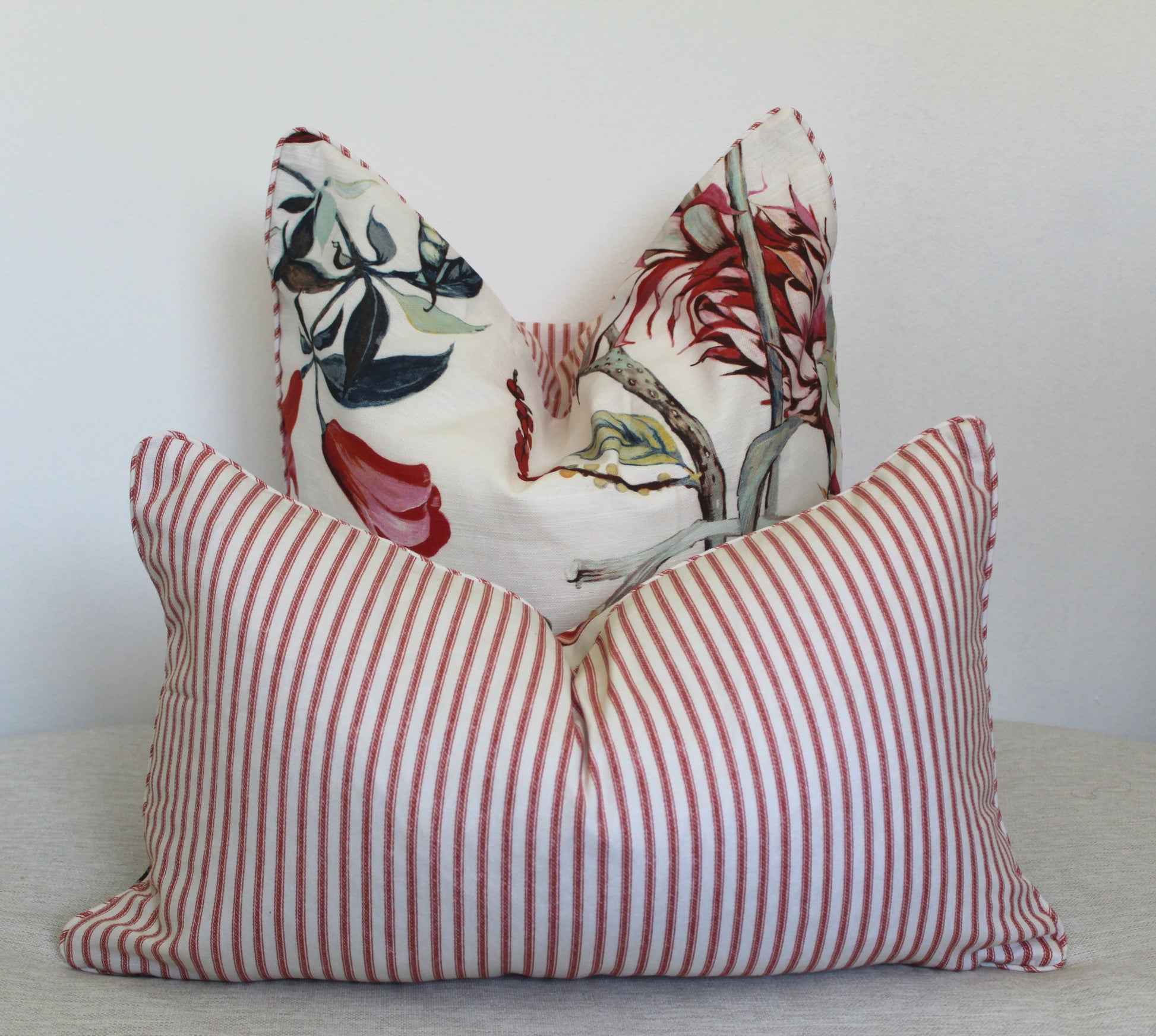 Reversible cushion covers using Tropical Fruits featured fabric and backed with beautiful ticking striped fabric.