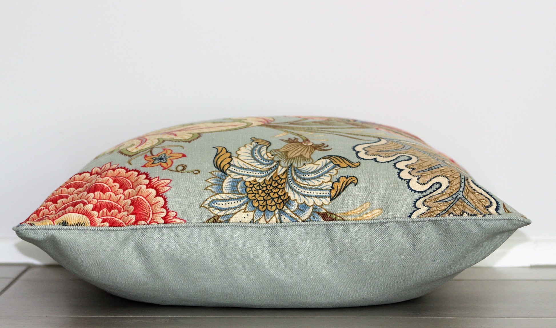 This luxurious finished linen (with matching color backing) cushion covers uses soft greens, creams and sea greens and reds in a traditionally formal design to add classic style to any space.