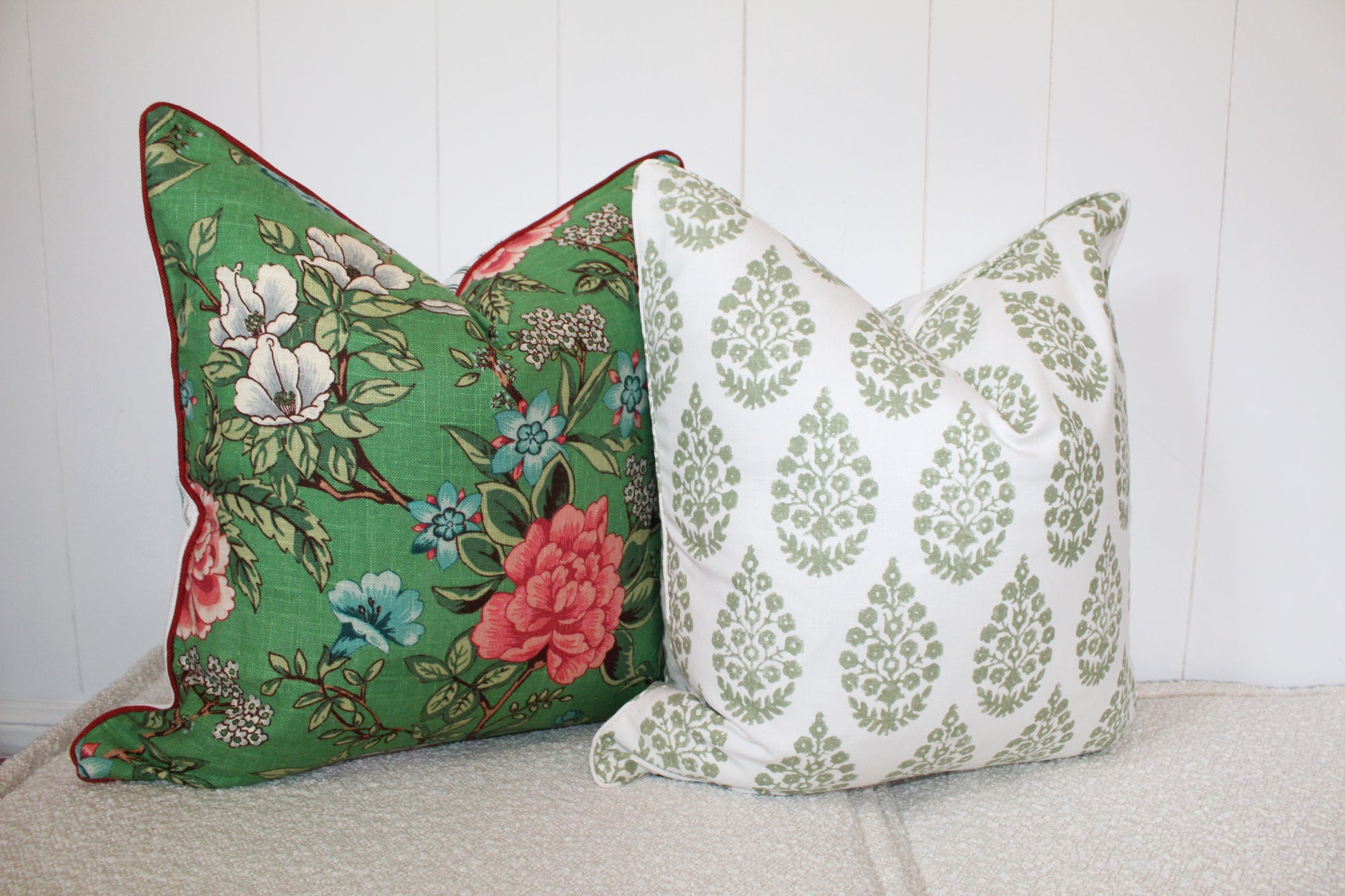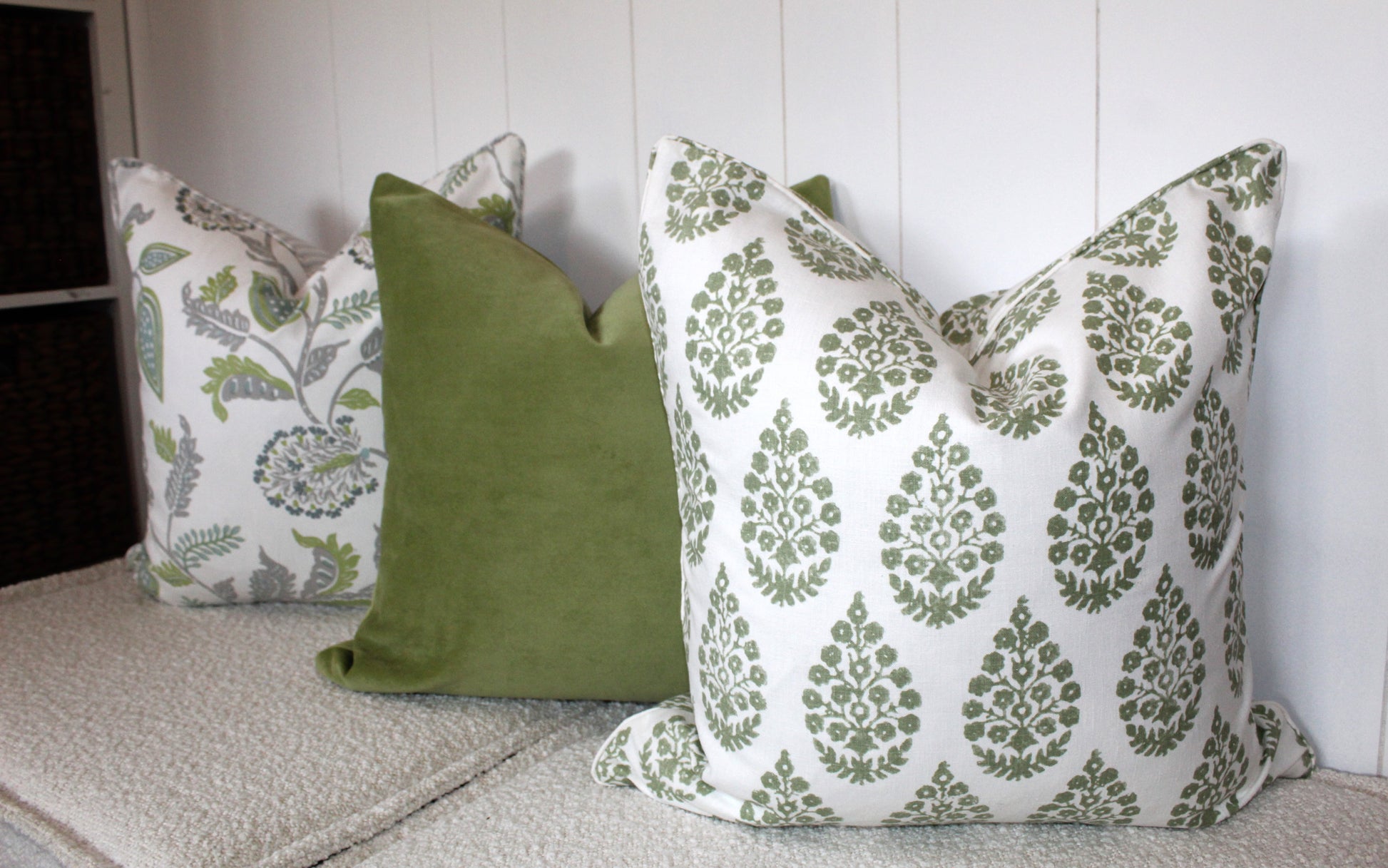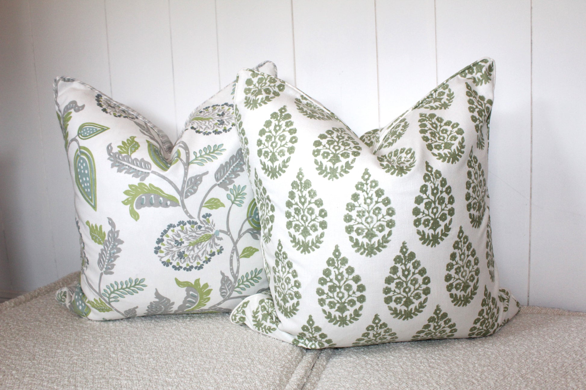 This green fabric has off white linen look background and goes beautifully with most of the covers which has green on them.