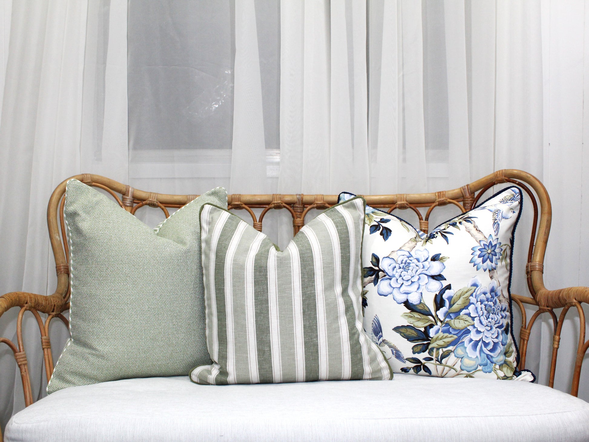 This is a beautiful addition to our shop. It has sage piping and sage backing.