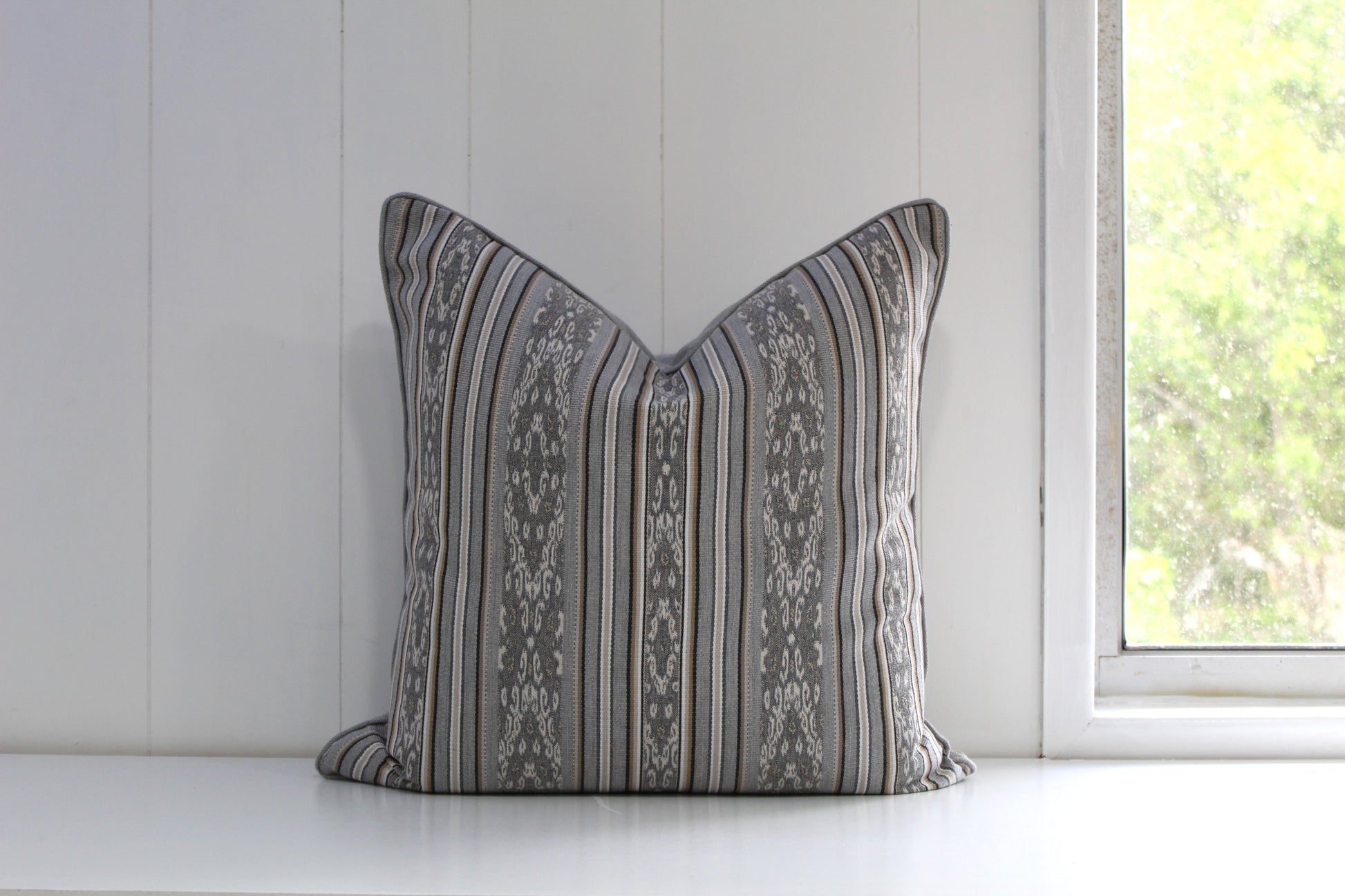 Beautiful luxurious fabric from Sunbrella turned into a cushion covers in our workshop. We make these covers with matching grey piping and backing.