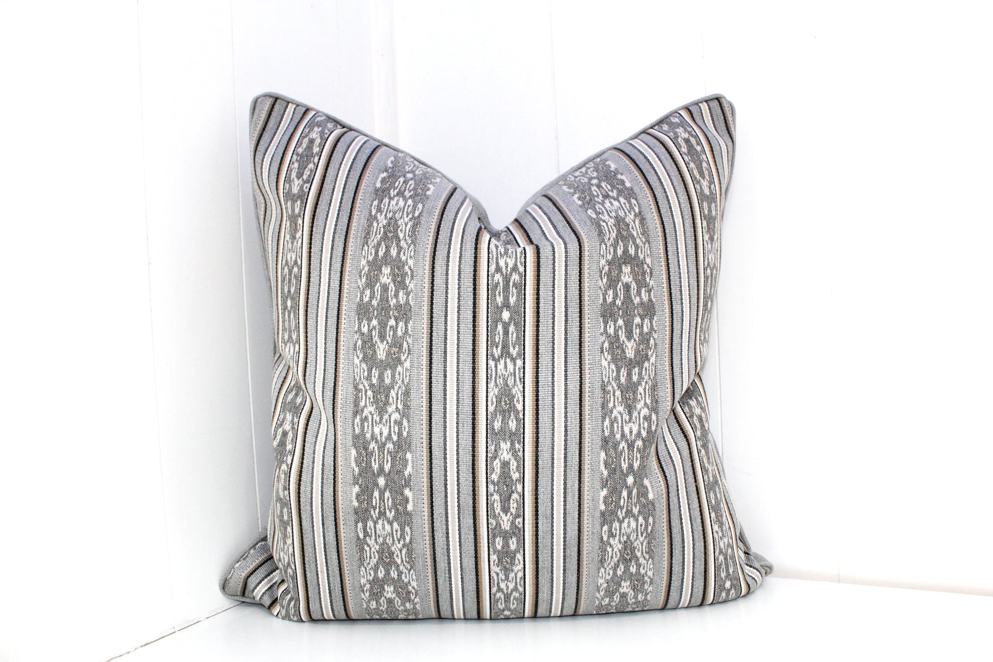 Beautiful luxurious fabric from Sunbrella turned into a cushion covers in our workshop. We make these covers with matching grey piping and backing.