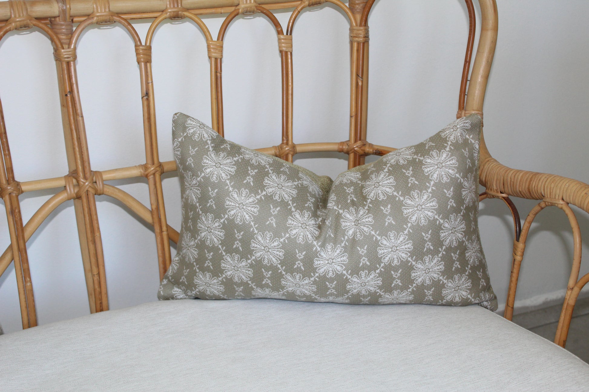 The lumbar cover is size 30x50 and has olive solid fabric for backing.