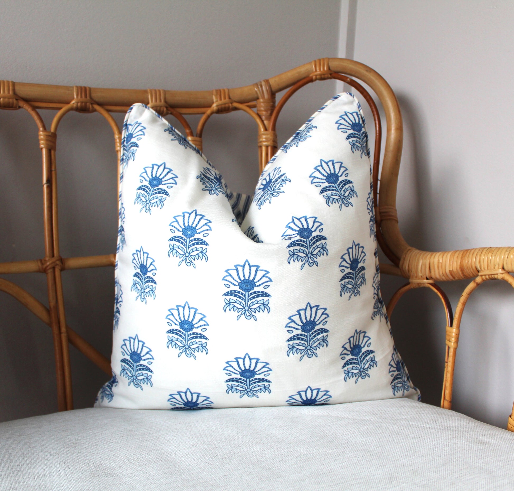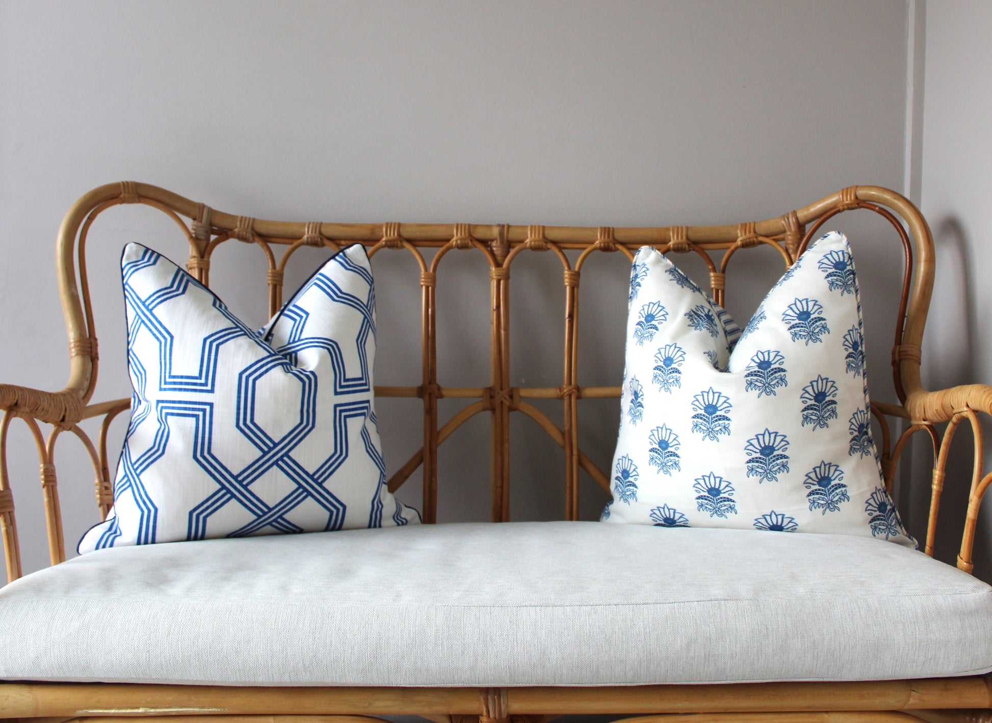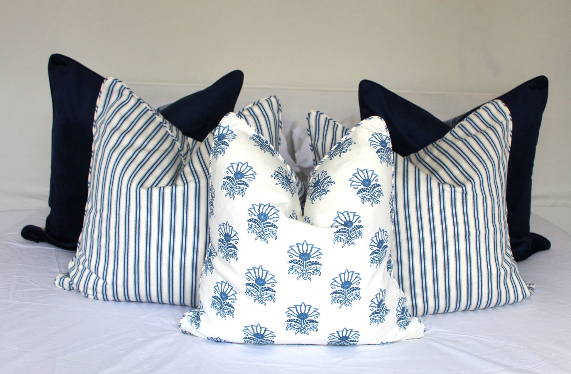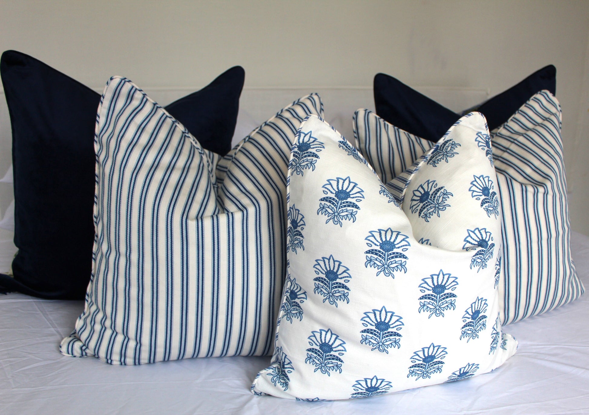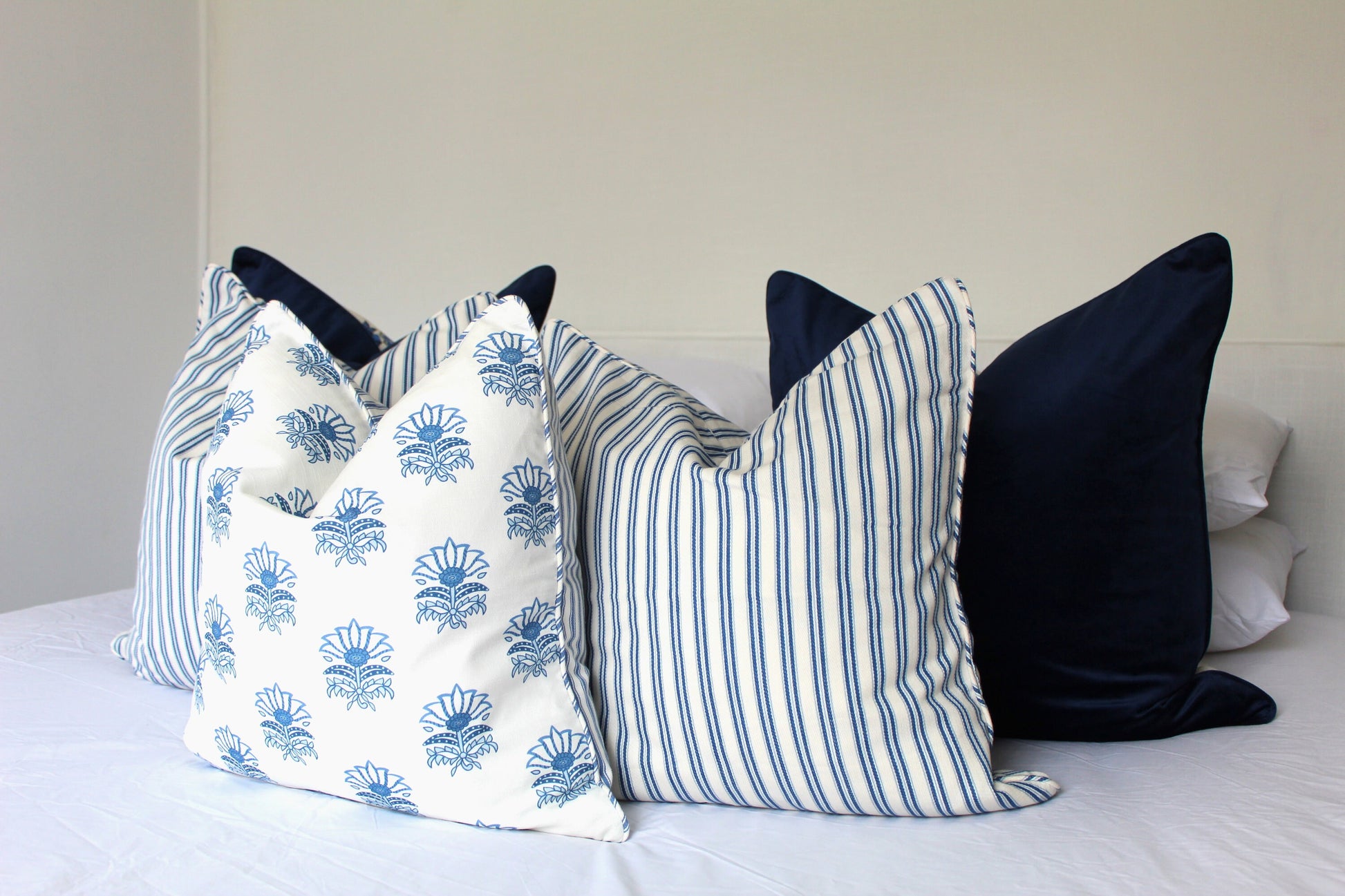Instead of backing it with plain solid fabric, our Denim Ticking fabric matched the blue on this fabric hence we used this shade of ticking fabric for piping and backing.