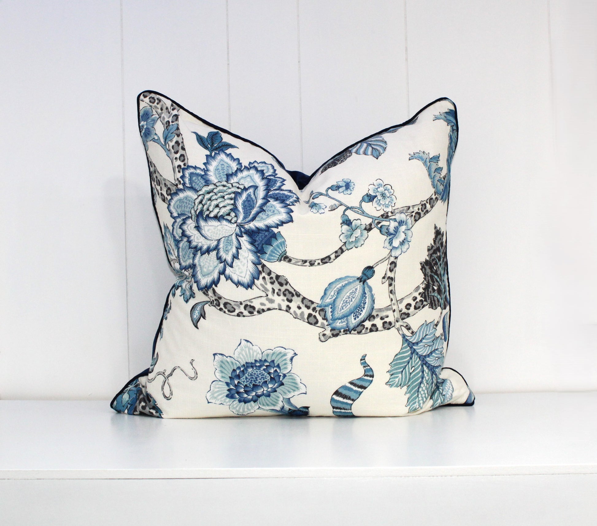 This beautiful throw pillow cover features Kaufmann’s Makalo printed cotton fabric in blue.