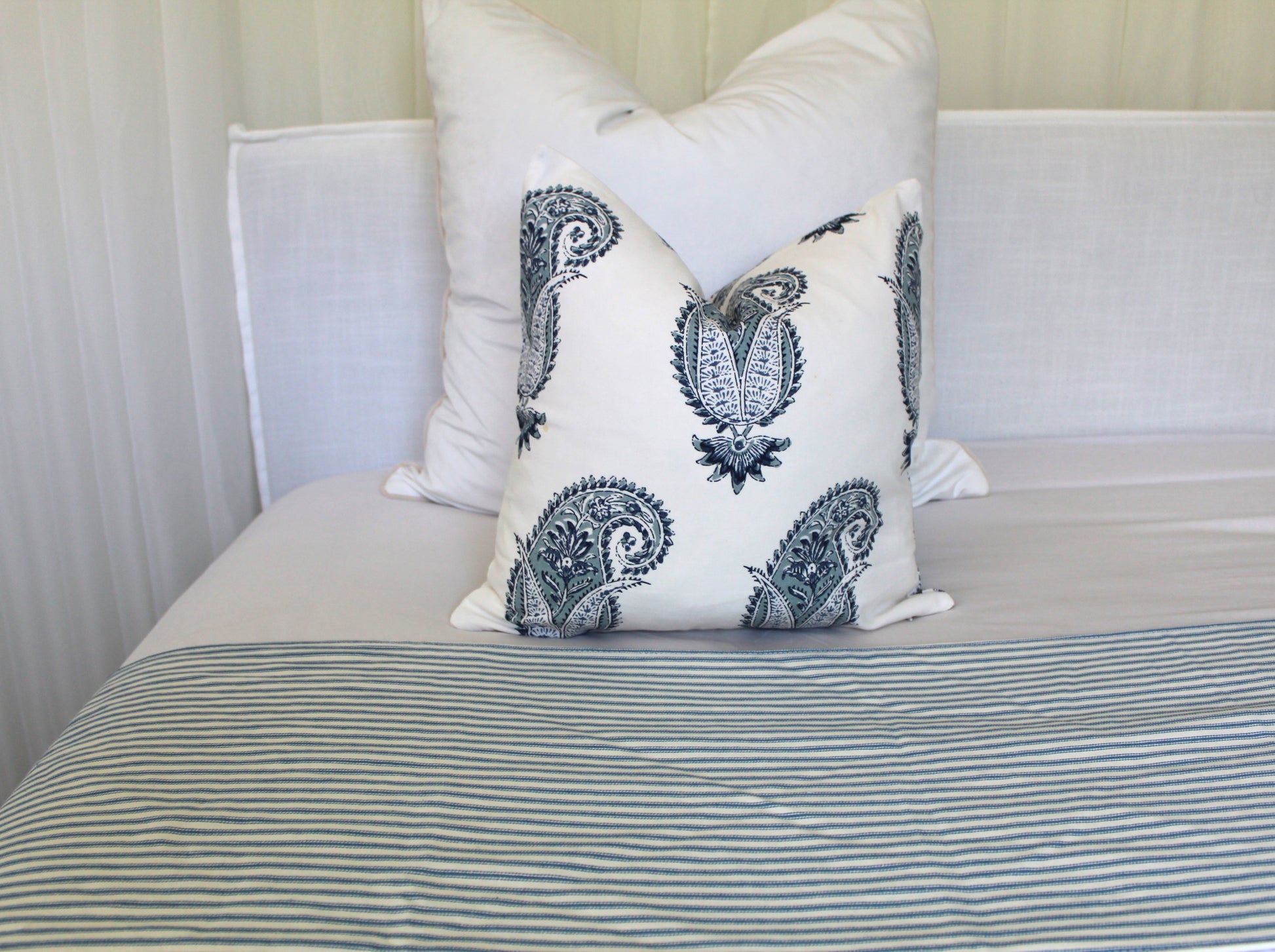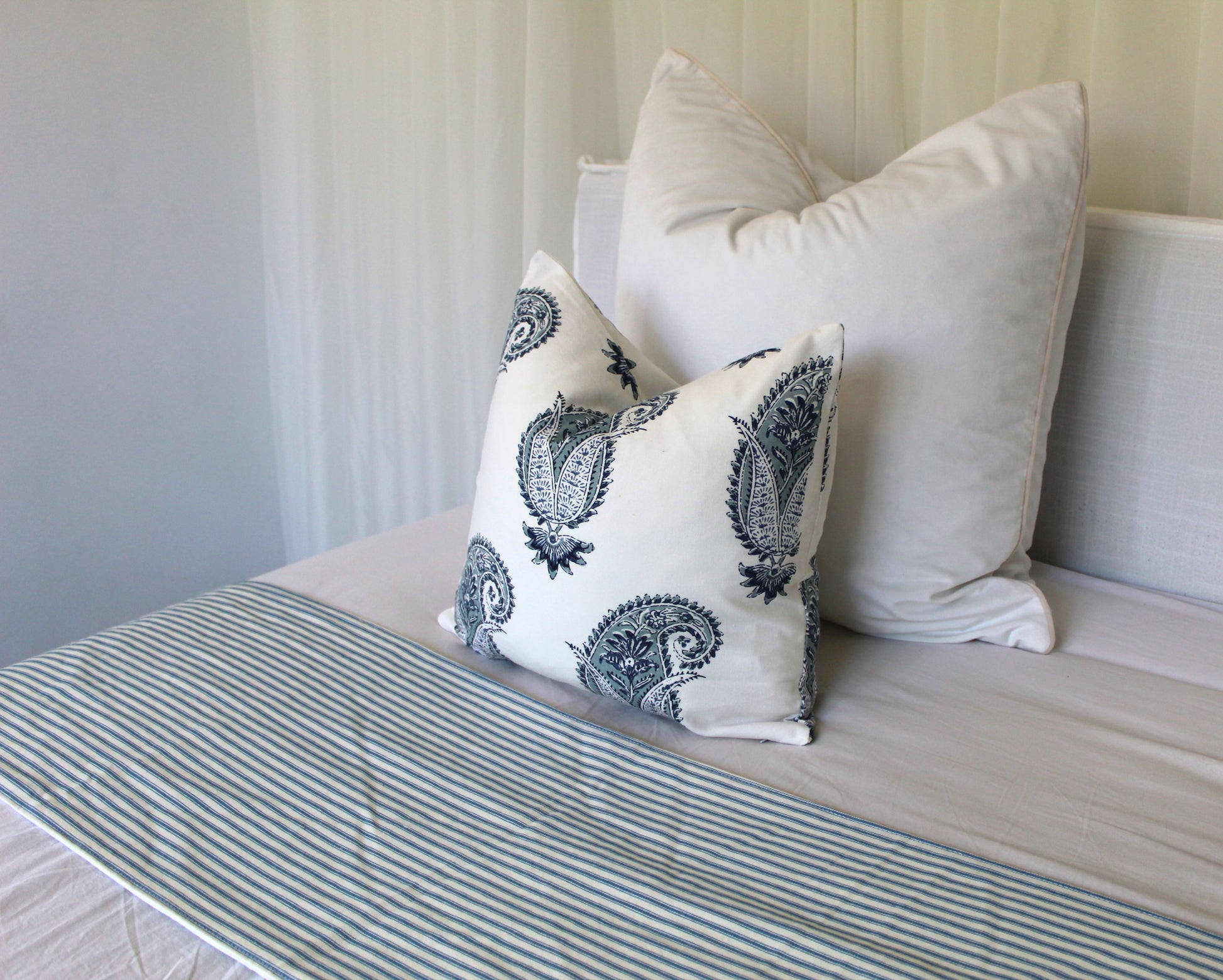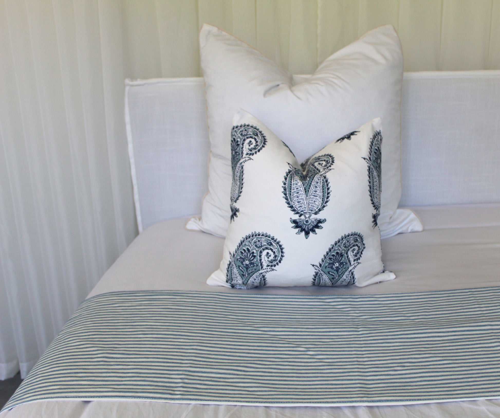 Waverley Denim ticking bed runner with matching cushion cover